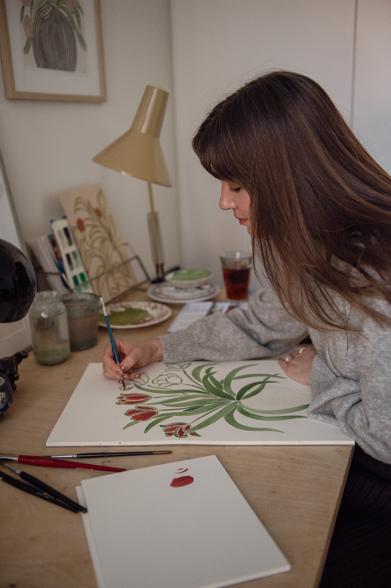 Meet Anine Iversen, the Copenhagen artist who’s behind some painterly floral pieces in our Bloom Collection. Having enjoyed watercolour painting and drawing since childhood, her artwork embodies vibrant hues, feminine aesthetics and organic forms. Her influences? Modern art, nature, fashion and the wild world of human emotions.
