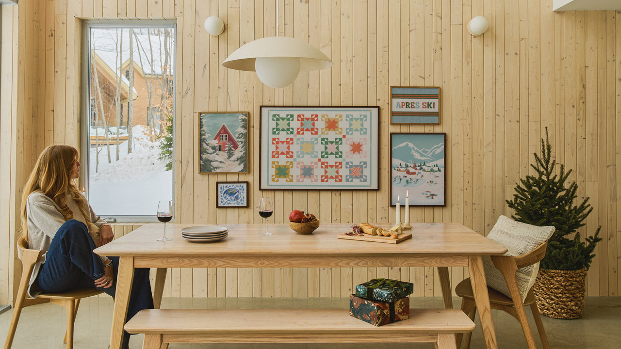 On the walls, pair our Green Quilt Block Print with the Red Starburst Quilt Print from O’Tannenbaum. Framed in solid oak, they capture that storybook cabin look.