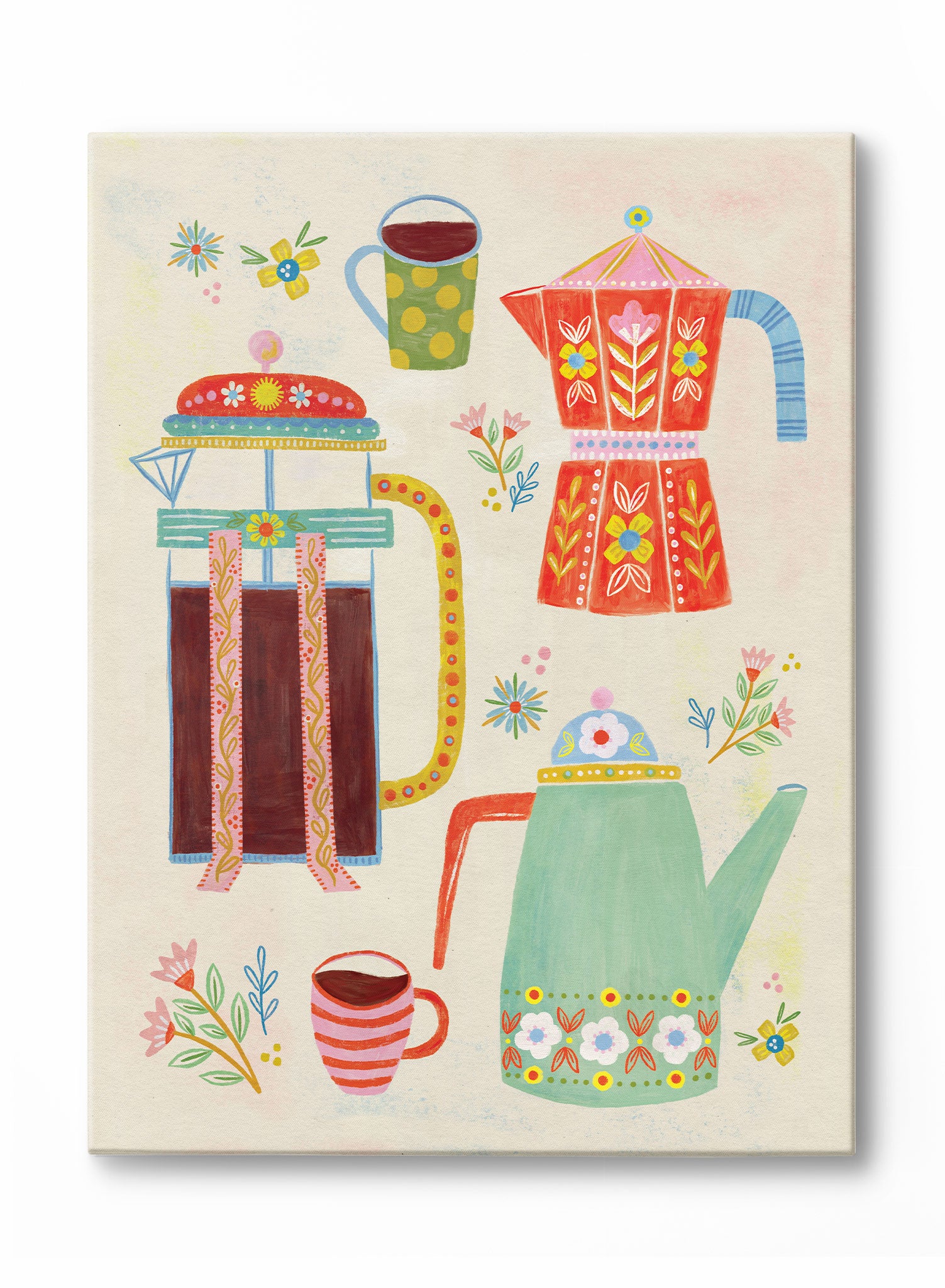 Coffee culture gets a folk-art remix in this playful print by Kenzie Elston. Decorated moka pots, French presses, and cheerful mugs gather like old friends, each dressed in layered patterns and blooming motifs.