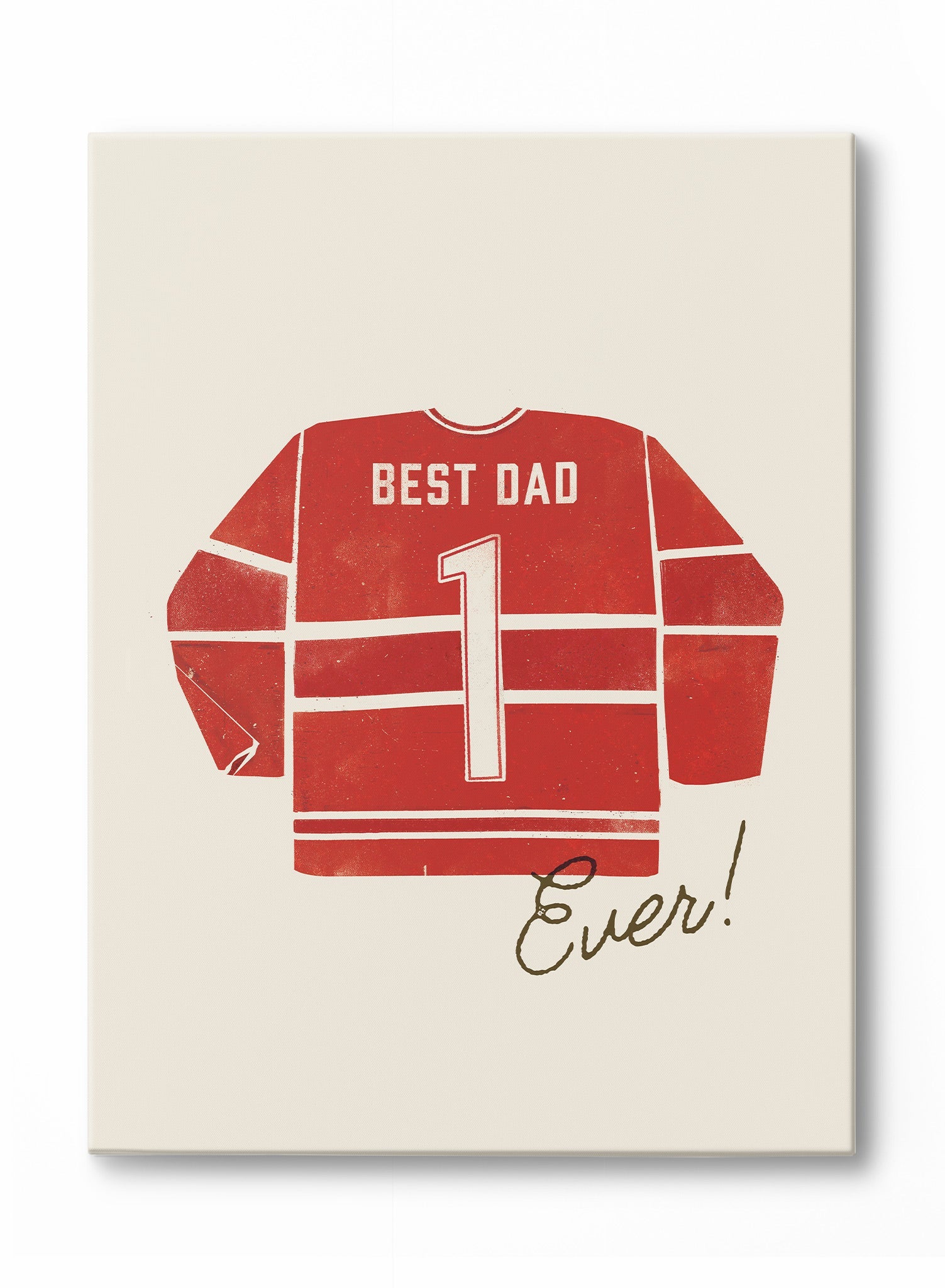 This classic red hockey jersey canvas proudly proclaims "Best Dad Ever!" offering a dynamic, sporty tribute with charming vintage flair. The distressed textures and bold lines enhance its authentic retro feel.