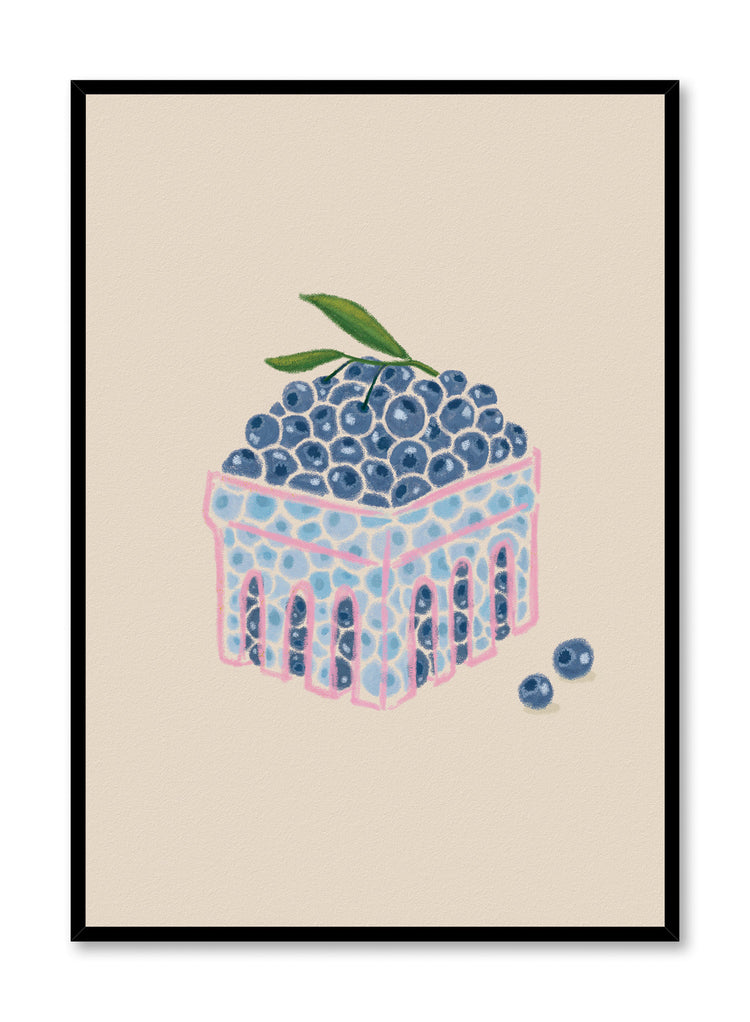 A pastel-hued basket brimming with fresh blueberries sits at the heart of this charming print. The hand-drawn texture of the berries, combined with the softly sketched container, gives it an artful, almost storybook-like appeal. A single sprig of green leaves adds a delicate contrast, completing the composition with a natural touch.