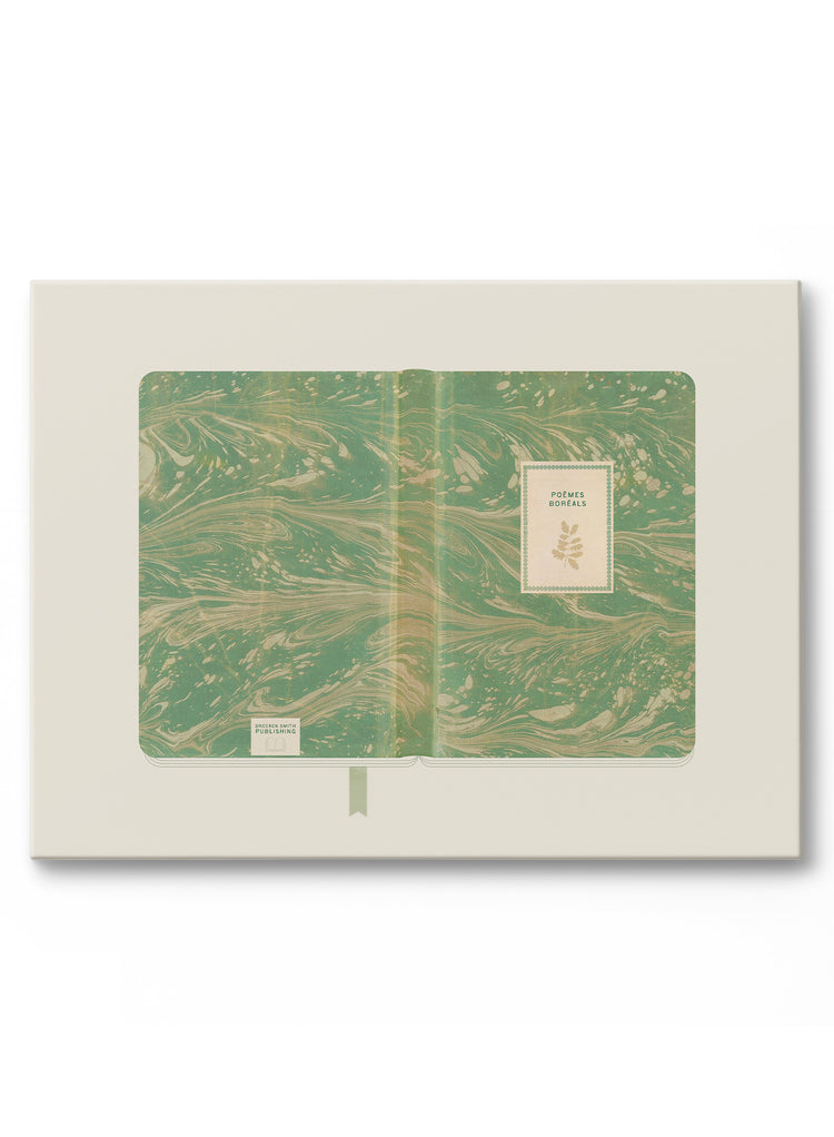 An open notebook reveals an exquisite marbled cover in shades of green and gold, titled "Poèmes Boréals" on its elegant label. The delicate design exudes timeless craftsmanship and literary allure.