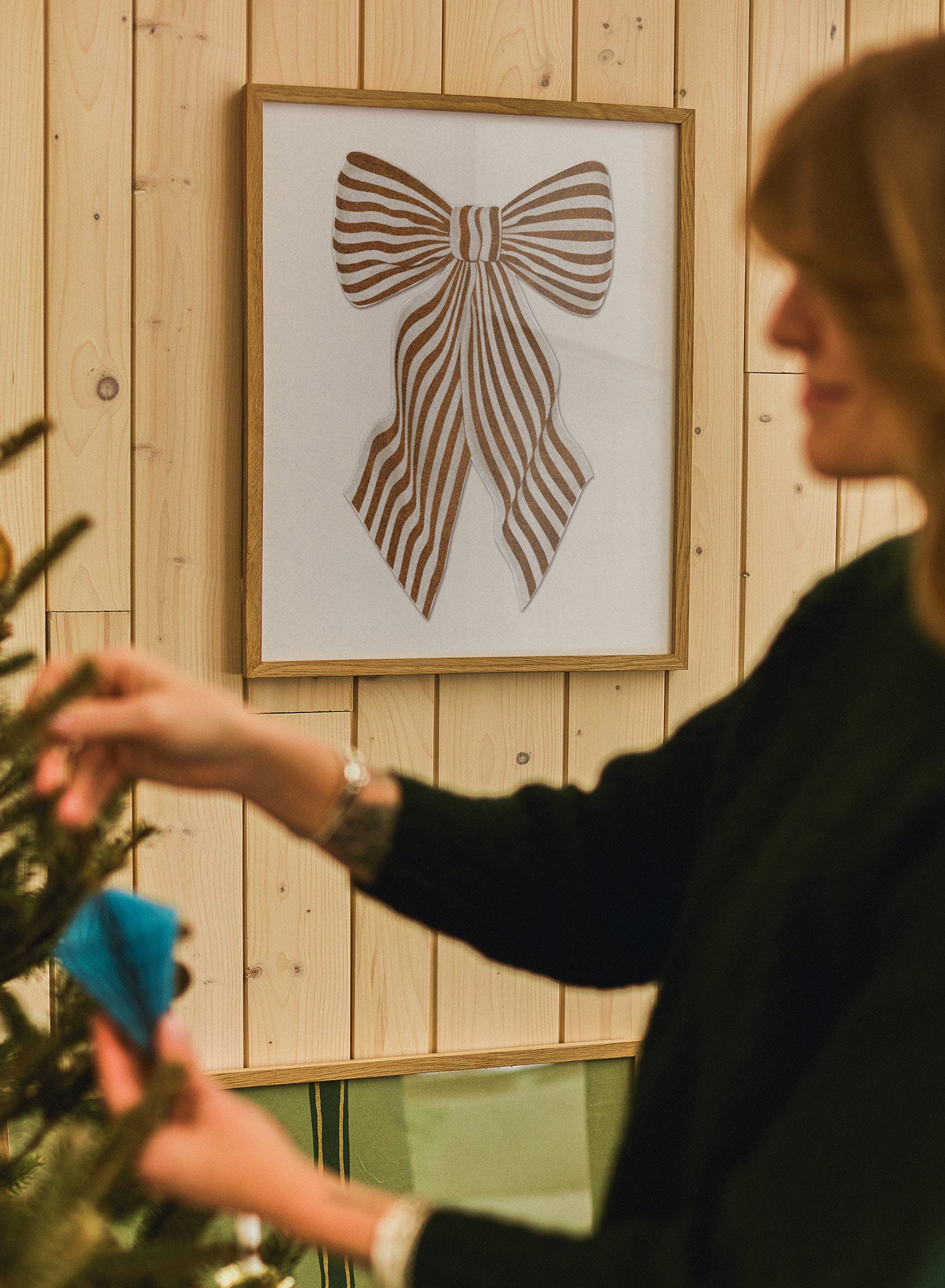 This print features a striking striped bow, elegantly rendered in warm, earthy tones. The bow's flowing ribbons create a sense of movement, while the bold stripes add a touch of modern flair. Set against a soft, neutral background, the composition is both simple and sophisticated, making it a versatile addition to any space.