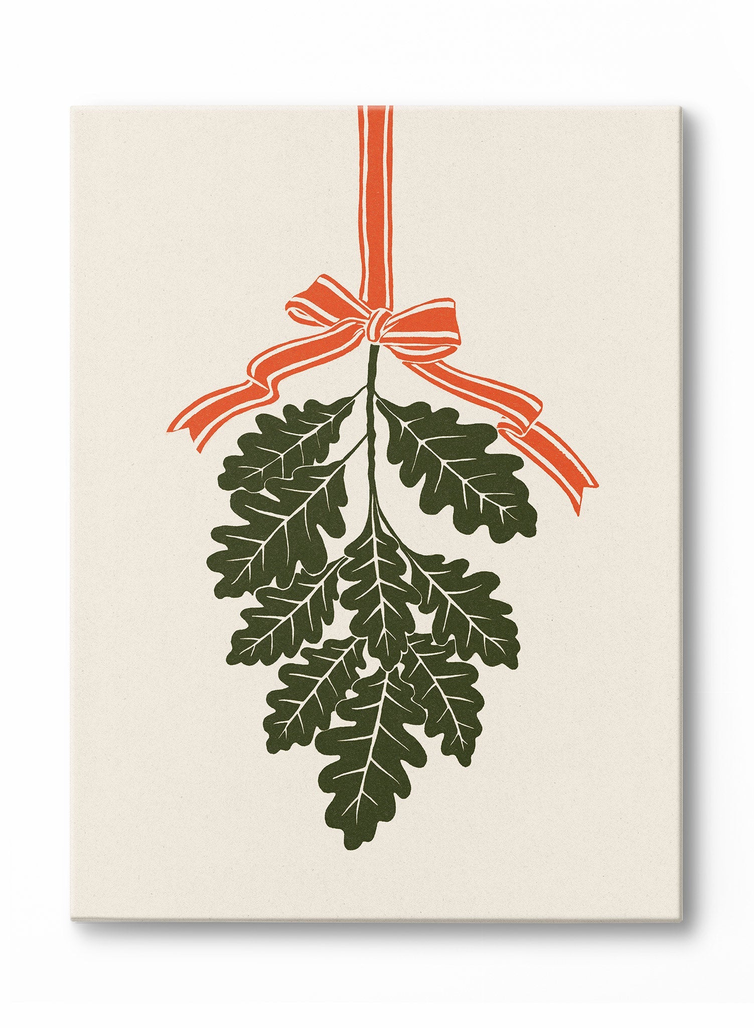 This canvas features a striking illustration of oak leaves tied with a bold, orange ribbon. The leaves, rendered in deep green, hang gracefully, creating a harmonious balance against the neutral background. The simplicity of the design draws attention to the intricate details of the leaves and the vibrant ribbon, offering a fresh take on traditional motifs.