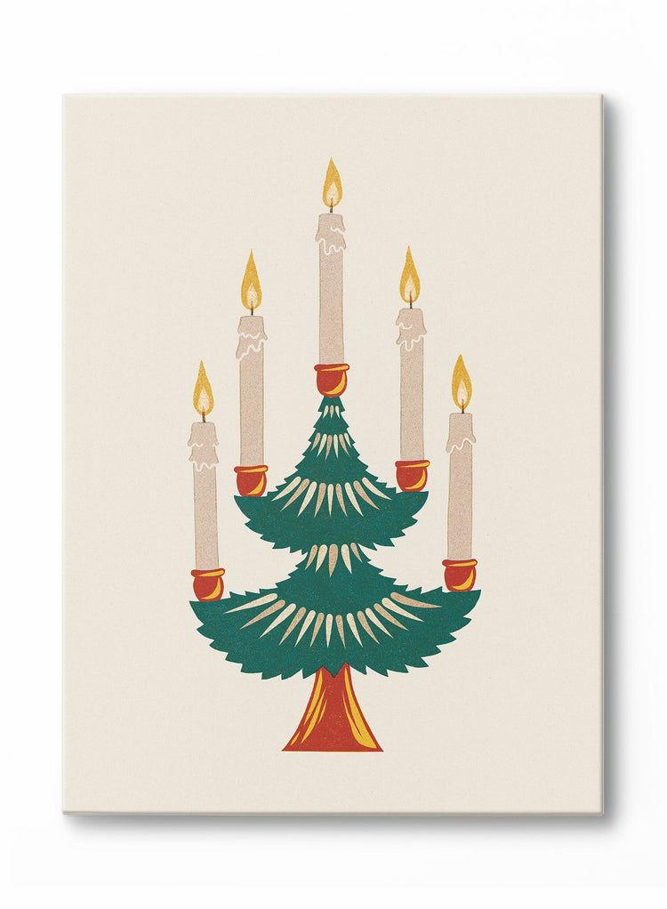 This canvas features a charming depiction of a stylized Christmas tree, cleverly designed to resemble a candelabra. The tree's branches are adorned with five lit candles, their flames flickering gently, casting a warm glow. The simplicity of the design is both striking and elegant, capturing the festive spirit with a touch of creativity.