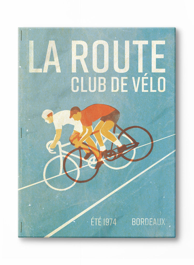 A charming throwback to cycling culture, this vintage-inspired canvas illustrates two competitive cyclists gracefully racing across an open track. The soft blues and warm, muted oranges are accented by bold retro typography, reflecting a stylish French aesthetic from summer 1974 in Bordeaux.