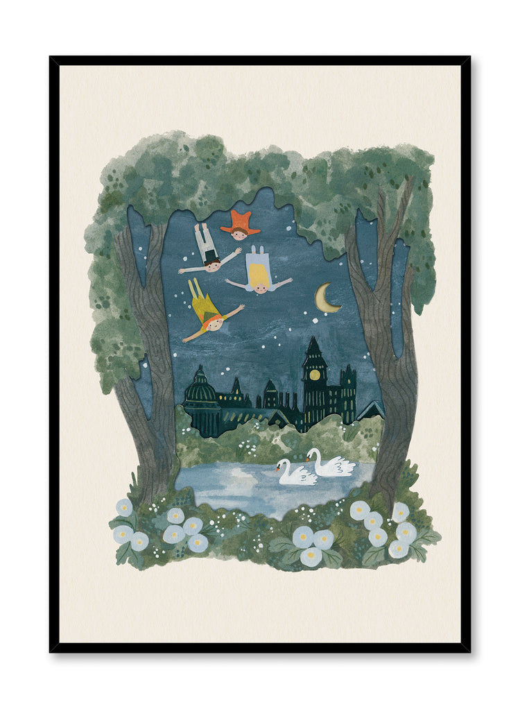 Nestled within a lush, moonlit forest, this enchanting print captures a whimsical scene of two children flying over a serene lake, with swans gliding gracefully below. The backdrop reveals a charming cityscape under a starlit sky, where a crescent moon hangs gently above. Framed by towering trees, the scene invites viewers to explore a world where imagination takes flight, offering a glimpse into a storybook adventure.