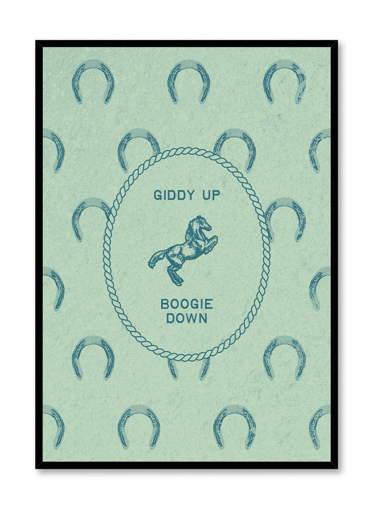 Bring some Western fun to your space with this 'Giddy Up Boogie Down' art print. Featuring blue text and illustrations on a light green background, it's perfect for playful and rustic decor.