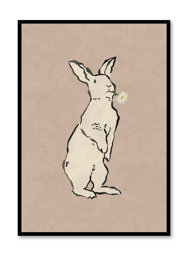This endearing rabbit illustration, holding a daisy delicately in its mouth, combines playful charm with artistic minimalism. Its muted beige background enhances the simplicity of the design.