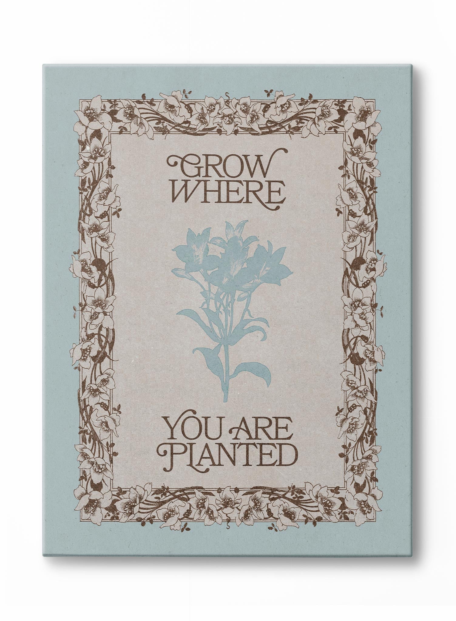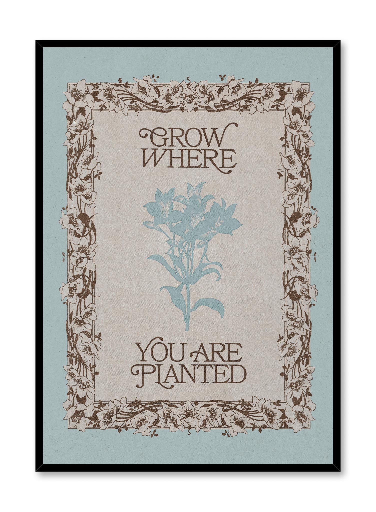 This vintage-inspired print combines intricate floral borders with an uplifting message: “Grow where you are planted.” The muted blue and brown tones lend a timeless appeal, while the floral detailing adds a romantic, nostalgic touch.
