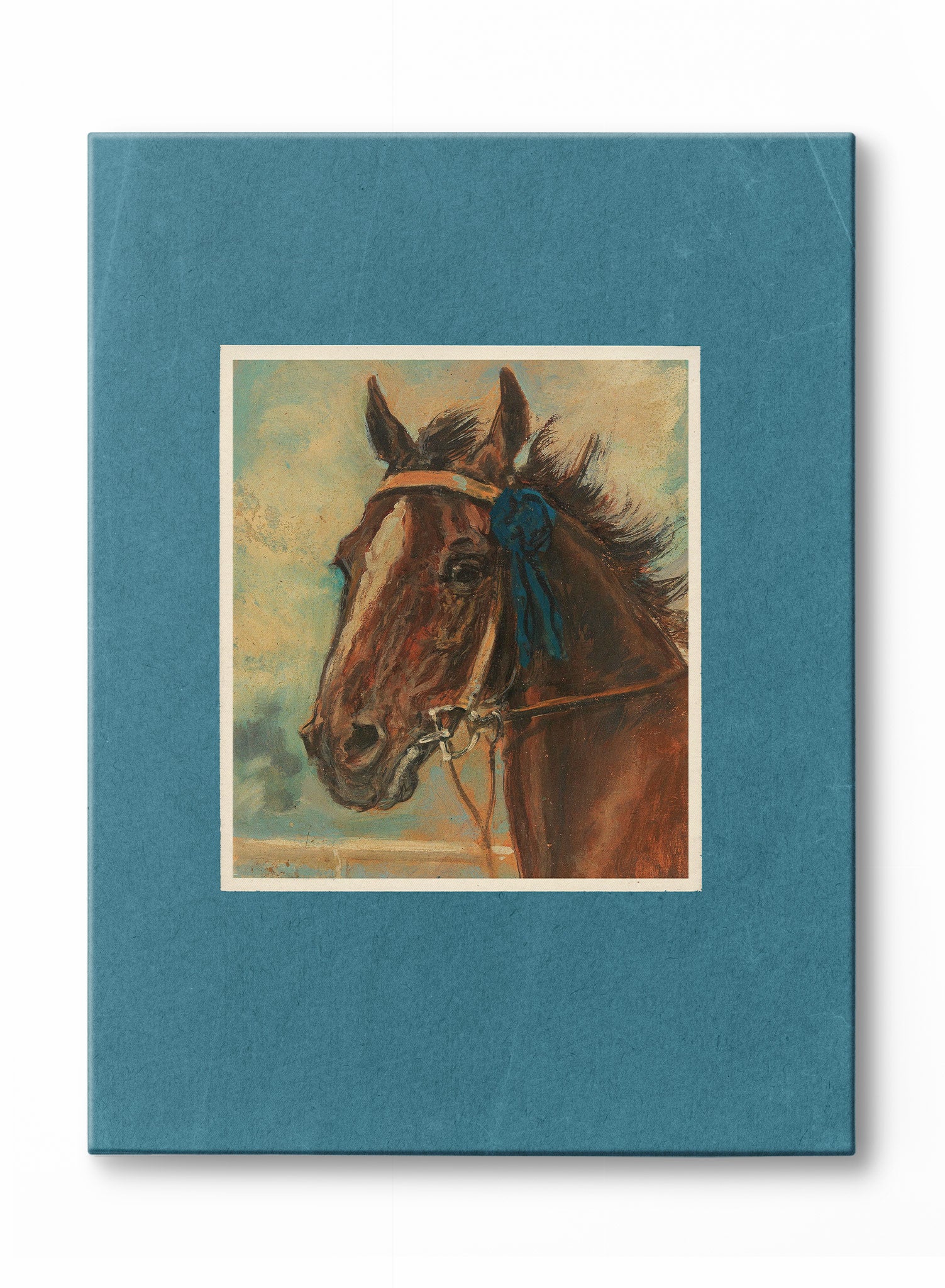 A beautiful canvas of a horse with a blue ribbon, set against a textured blue background. The detailed canvas captures the strength and elegance of the horse, making it a striking addition to any equestrian-themed room. The soft earthy tones of the horse contrast beautifully with the rich blue background, adding depth and character to the canvas.