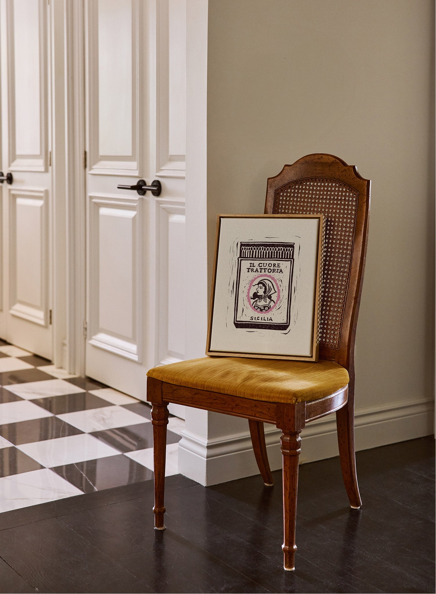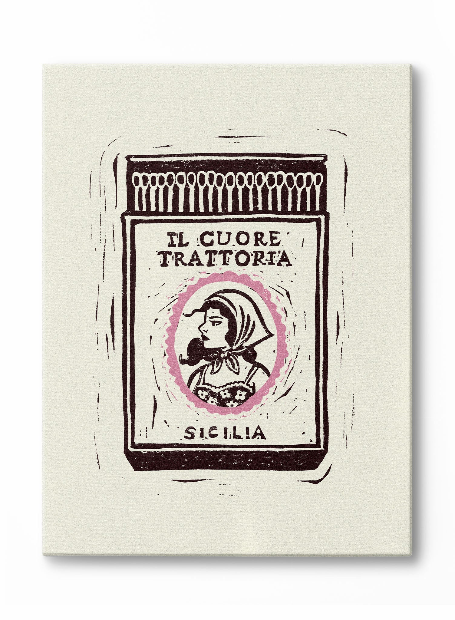 This linocut canvas features a vintage-style matchbook from a fictional Sicilian restaurant, "Il Cuore Trattoria," which translates to "The Heart Trattoria." The label shows a classic portrait of a woman in a headscarf, framed by a delicate pink oval. The hand-carved aesthetic gives the piece a rustic and soulful quality, evoking the warmth of a family-run Italian eatery.