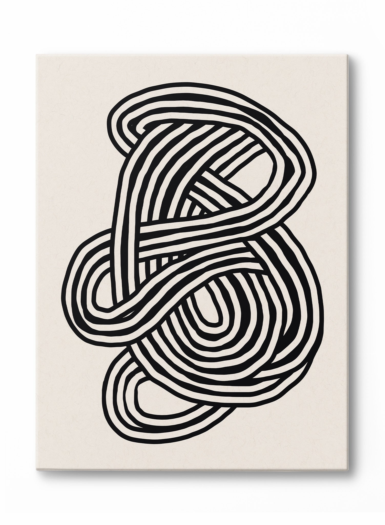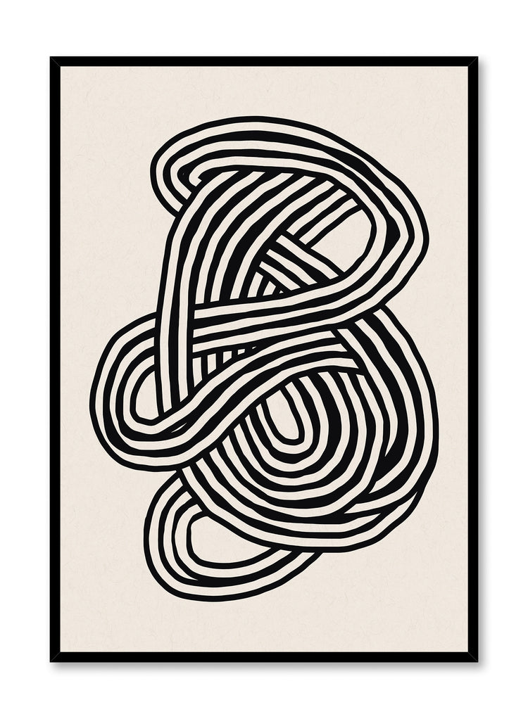 This fluid, interwoven form flows across a warm cream background with the deliberate restraint that defines the piece, curated for Keefer House. The continuous black lines curve and loop in organic patterns that echo the rhythmic gestures of traditional calligraphic brushstrokes, embodying Asian minimalism through pure abstraction.