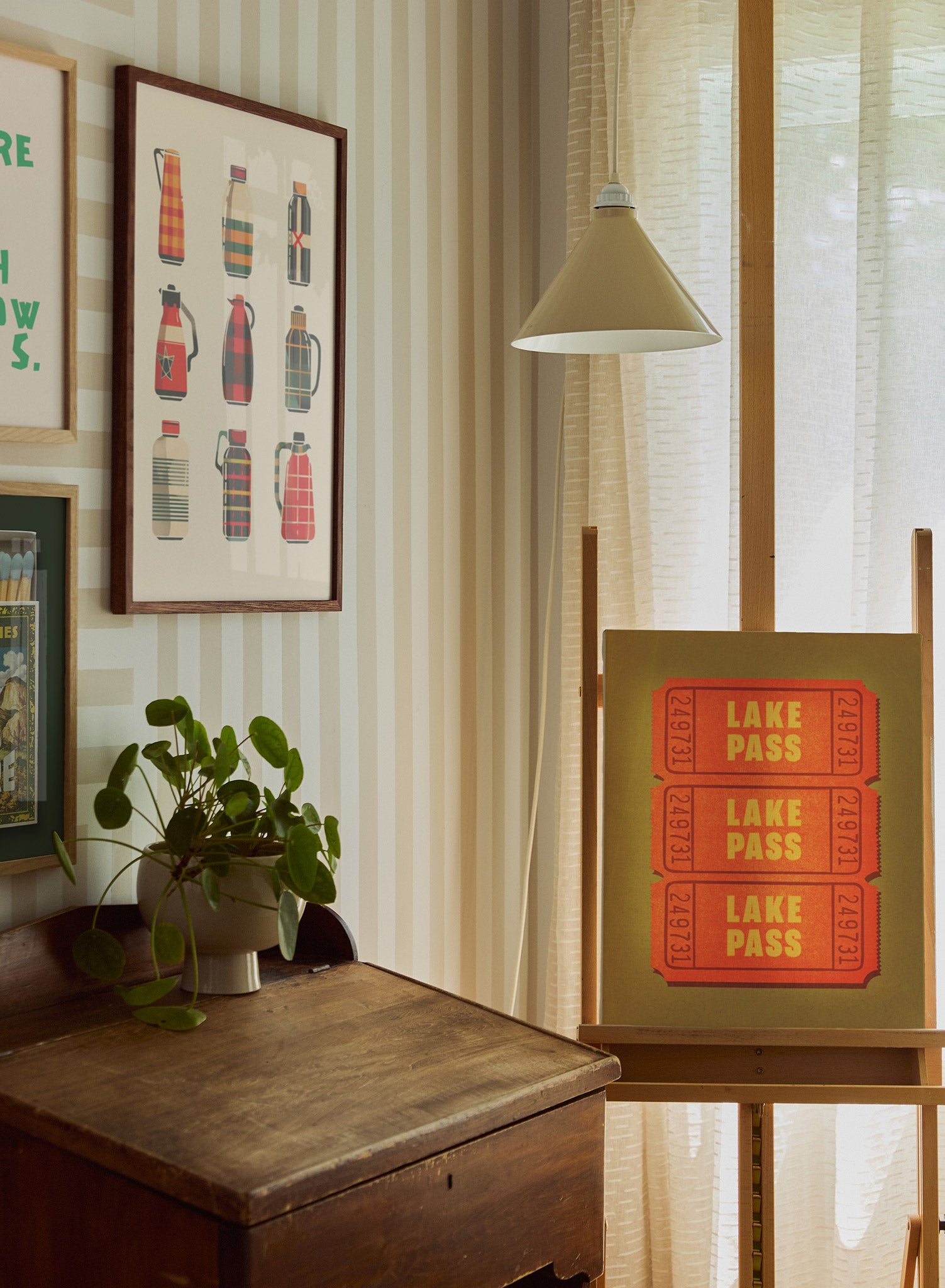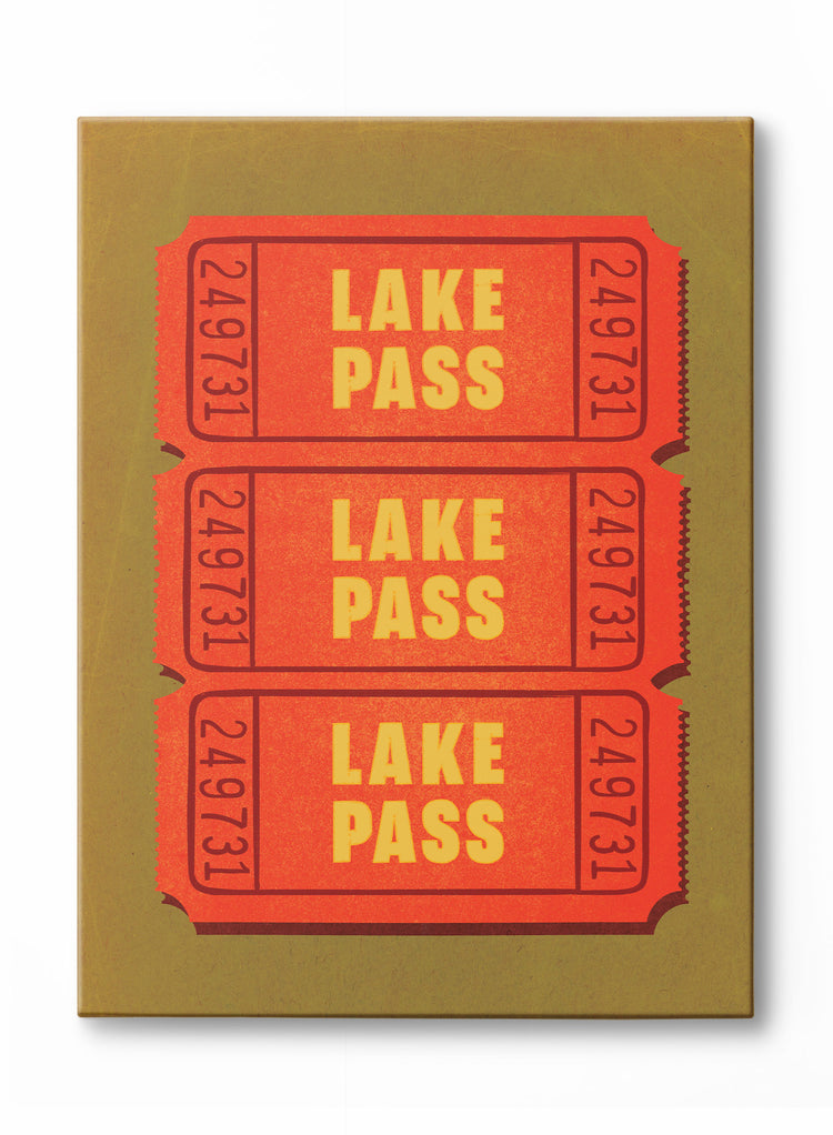 A striking vintage-style canvas featuring three bold red tickets labeled 'Lake Pass' against an earthy olive background. Each ticket showcases a unique serial number, adding an authentic retro feel to the piece. The vivid red and yellow typography contrasts beautifully with the muted backdrop, making this canvas a perfect addition to any nostalgic or travel-themed décor.