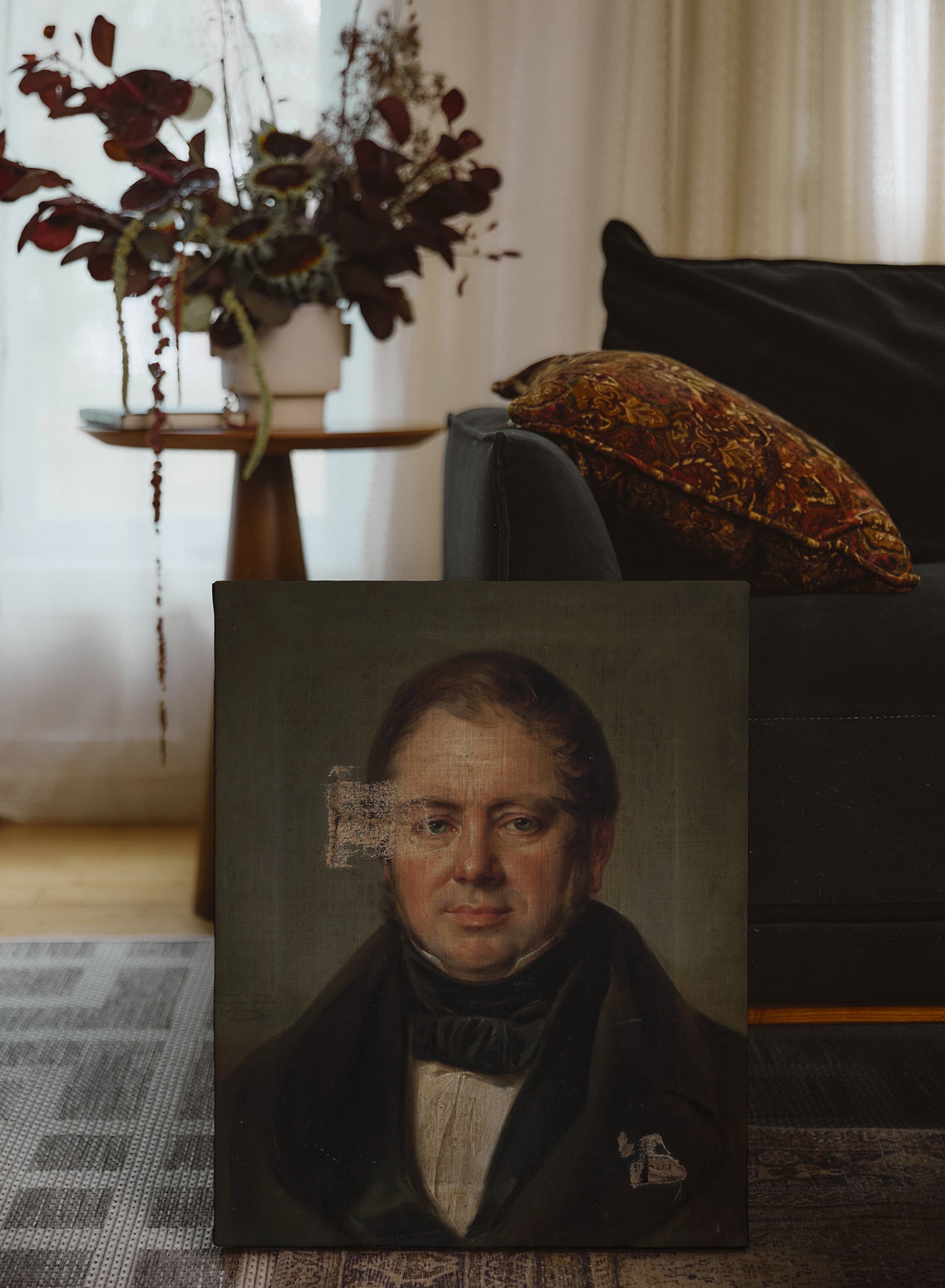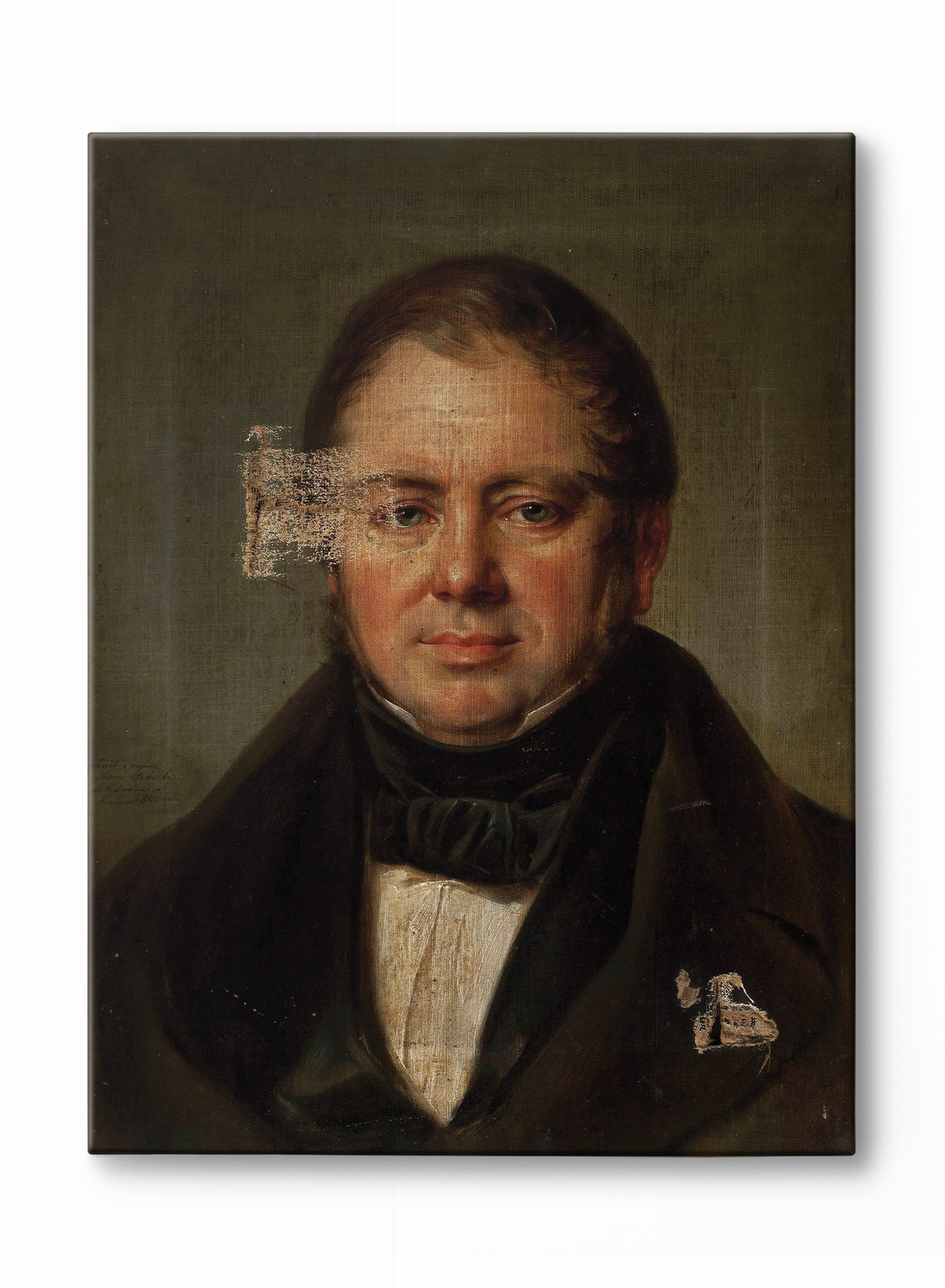 The worn texture of the canvas, especially visible around the edges of his face, adds an element of history and age to the painting, as if it has witnessed years of quiet observation. His formal attire, a dark suit and a neatly tied cravat, reflects both his dignity and his status.