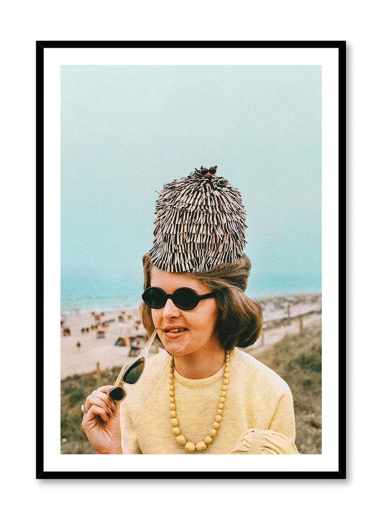 A captivating portrait of quirky elegance, this gallery-quality archival print celebrates a unique and unforgettable sense of style. The woman’s thoughtful expression is framed by her chic accessories: a stunningly original, textured beehive-style hat, a sunny yellow beaded necklace, and a pair of sunglasses held playfully to her lips. Discovered in rare photo archives, this image feels like a treasured frame from a stylish European holiday, capturing a personality that is as bright and memorable as the coastal sun.