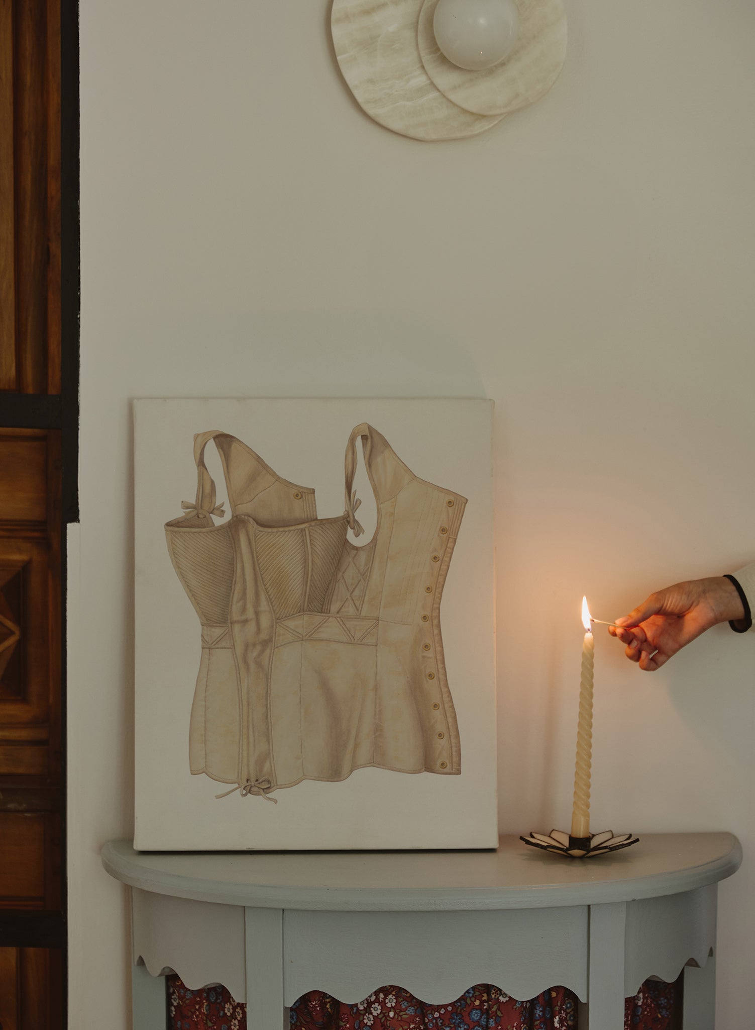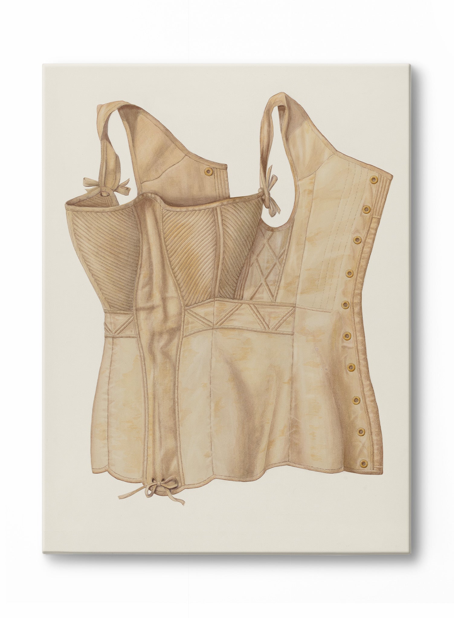 A delicate and precise illustration of a vintage corset, this canvas captures the fine details of a garment that was once both functional and fashionable. The soft beige fabric, stitched with care, creates a sense of structure and support, while the carefully drawn laces and button details highlight the corset’s intricate construction.