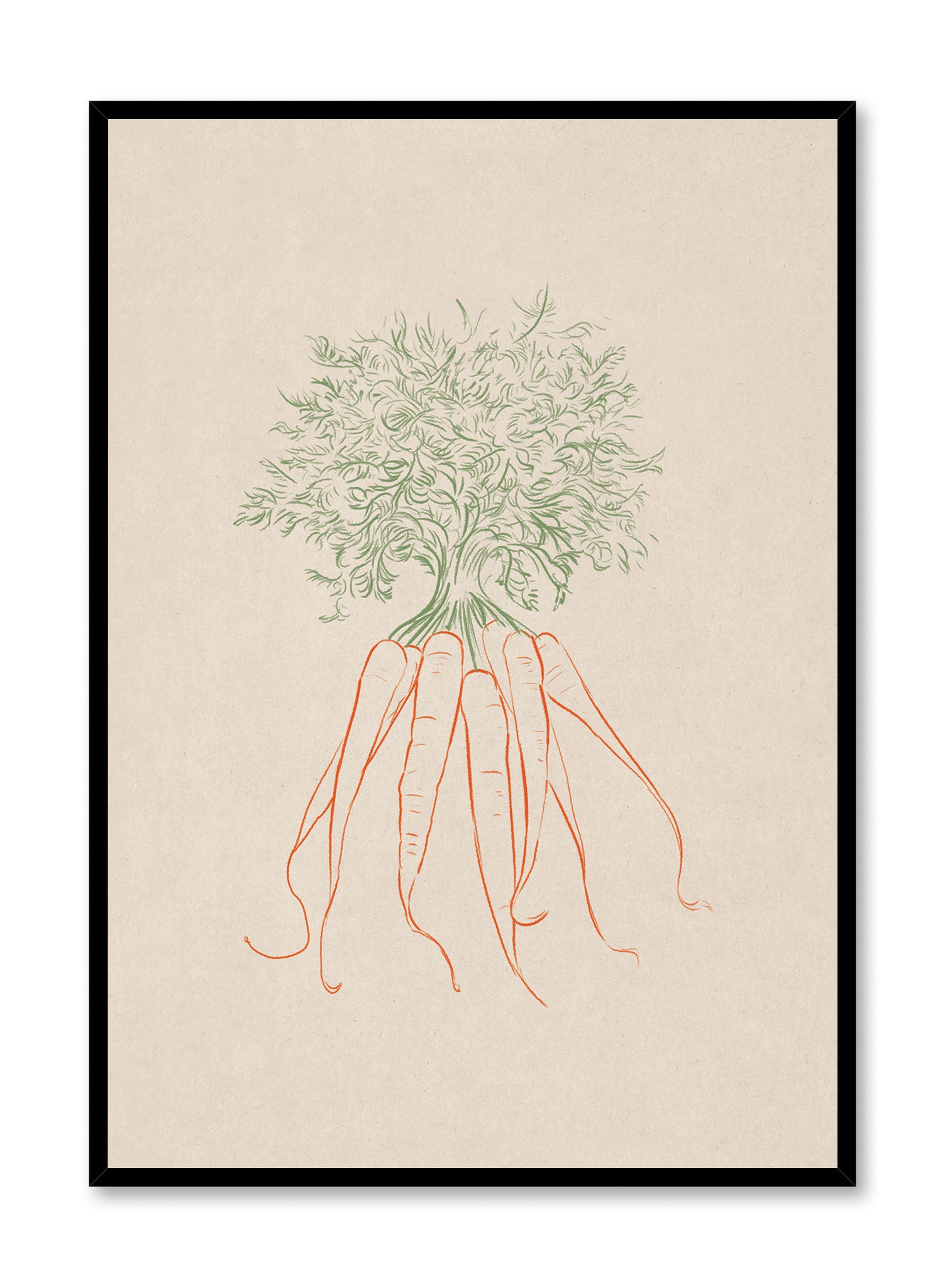 This beautifully intricate illustration reimagines a bunch of carrots as the roots of a flourishing tree, blending nature and food artistry in an unexpected way. The fine linework highlights the leafy tops as a lush canopy, while the long, twisting carrots anchor the composition with a natural elegance. The earthy green and orange hues contrast softly against the neutral background, giving it an organic, vintage feel.