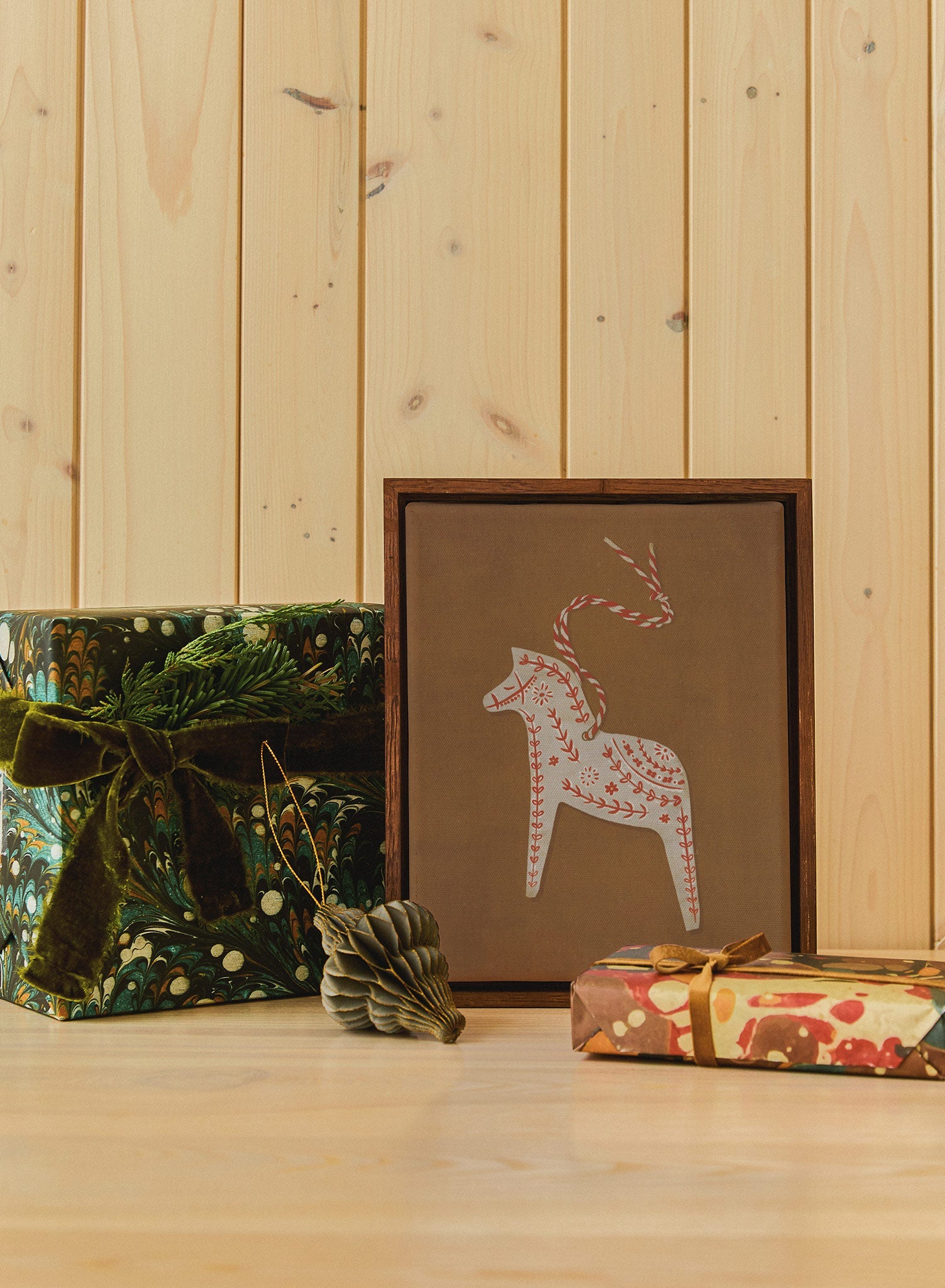 This canvas features a charming wooden horse ornament, adorned with intricate red and white patterns that evoke a sense of traditional craftsmanship. The horse is set against a warm, earthy brown background, with a red and white striped string looped through its top, suggesting it’s ready to hang as a festive decoration. The simplicity of the design, combined with its folk art style, brings a nostalgic touch to the piece.