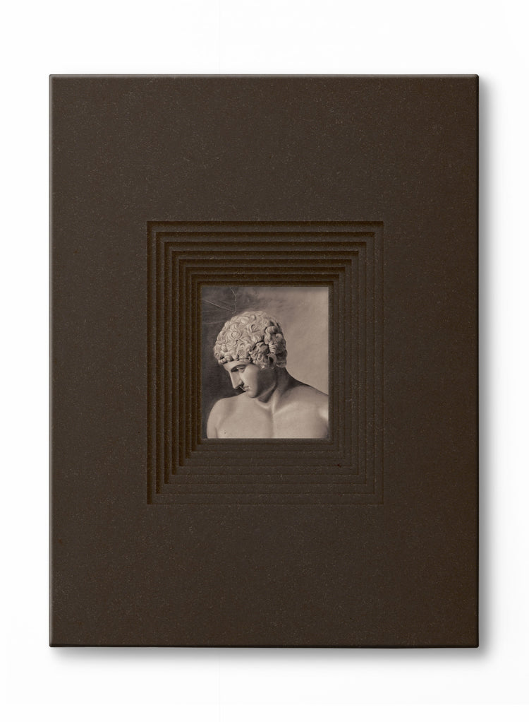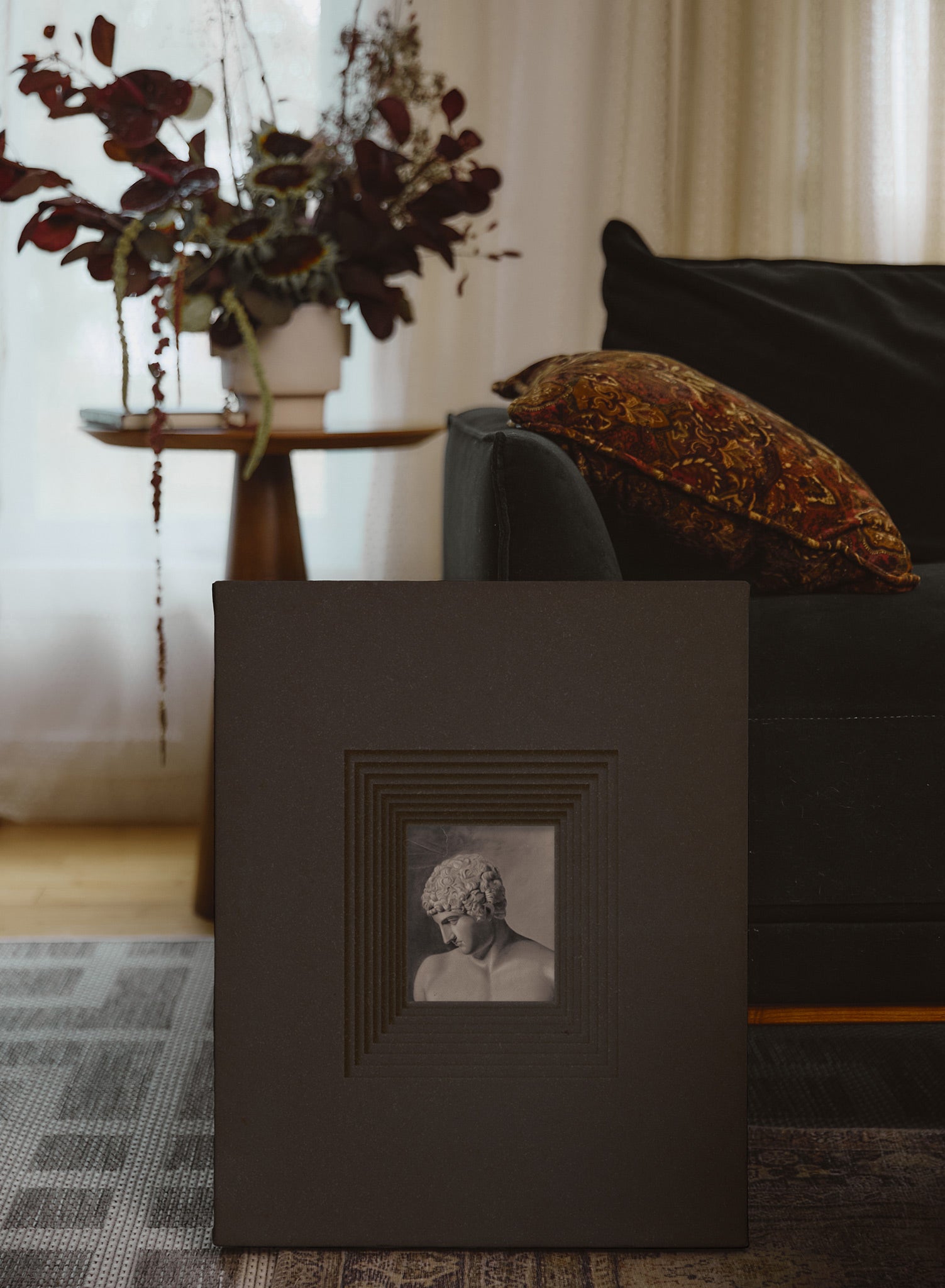 A framed canvas featuring a bust of an ancient Greek statue, this image exudes timeless elegance. The monochrome palette, set against a textured, layered frame in shades of black, directs focus to the intricately sculpted head of the statue.