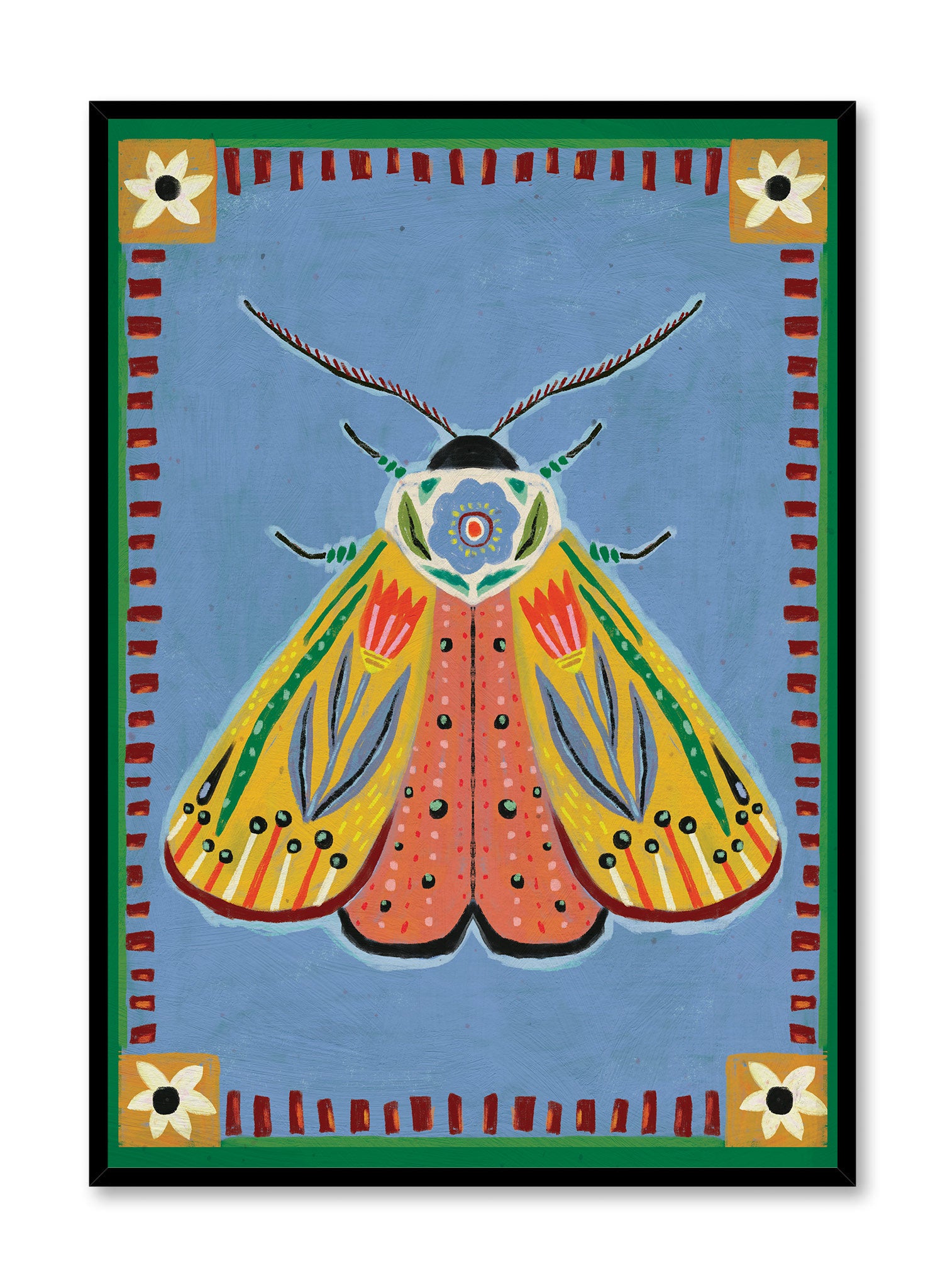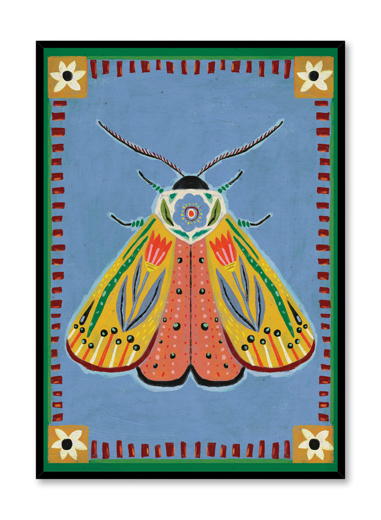 Kenzie Elston reimagines the moth as muse in this rich folk-art illustration. Its wings unfurl like embroidered panels, adorned with stylized tulips, dots, and linear motifs. The robin’s egg blue background is framed in deep green and red for a bold pop.