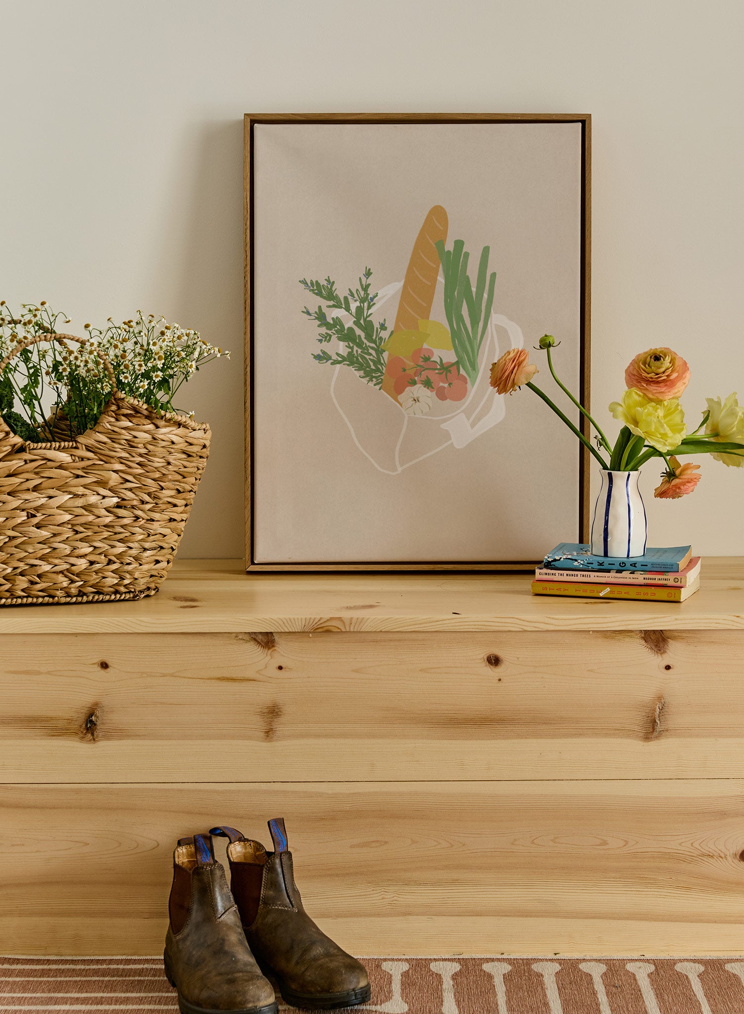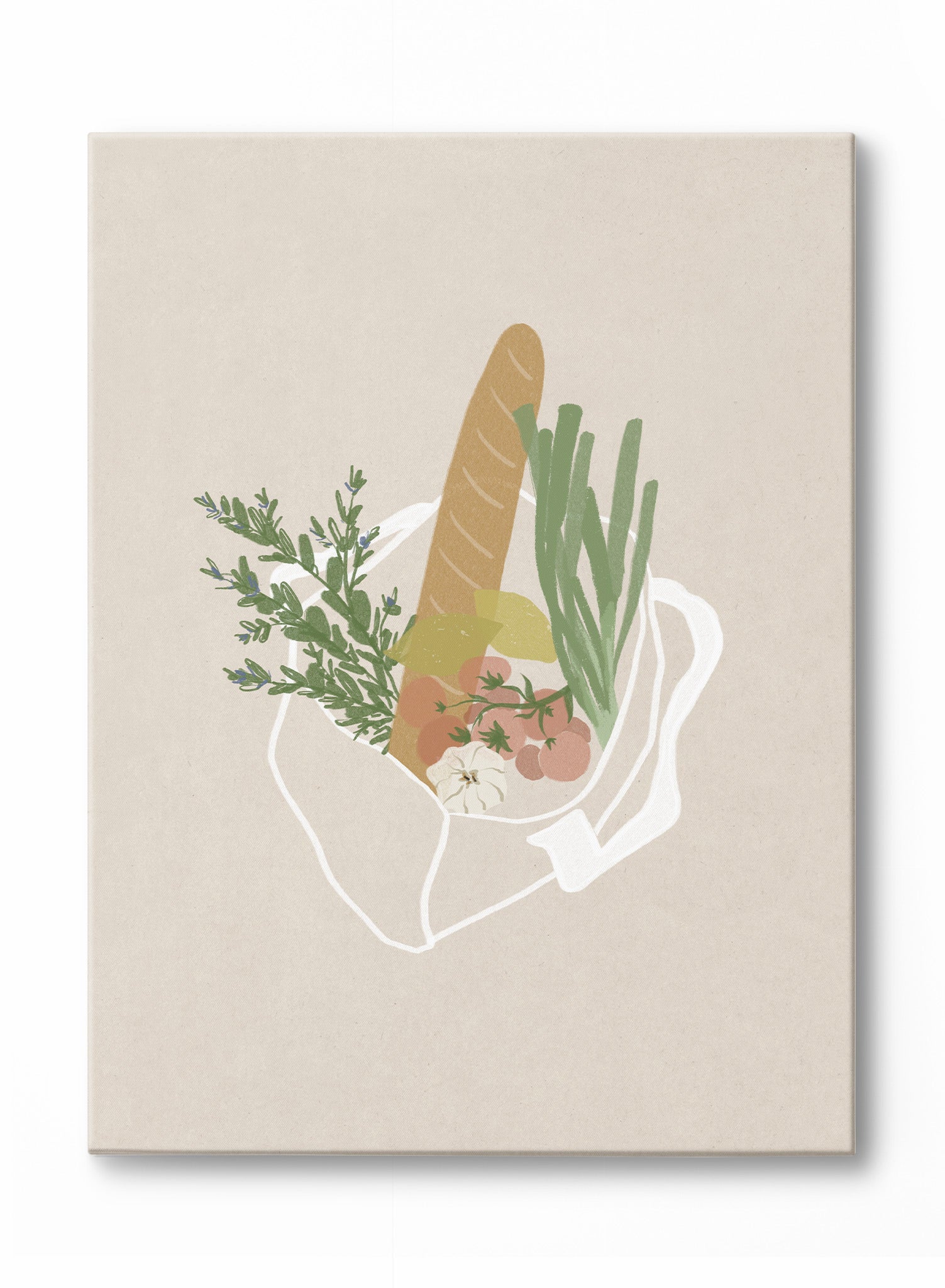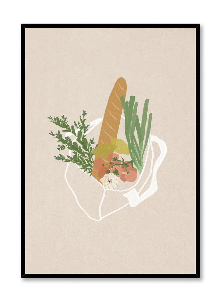 A beautifully illustrated market tote overflows with fresh produce in this charming print. Crisp baguettes, vibrant greens, juicy tomatoes, and aromatic herbs peek out from the open canvas bag, evoking the feel of a perfect morning at the farmers' market. The minimal linework combined with soft, earthy tones keeps the composition light and airy, making it feel both modern and timeless.