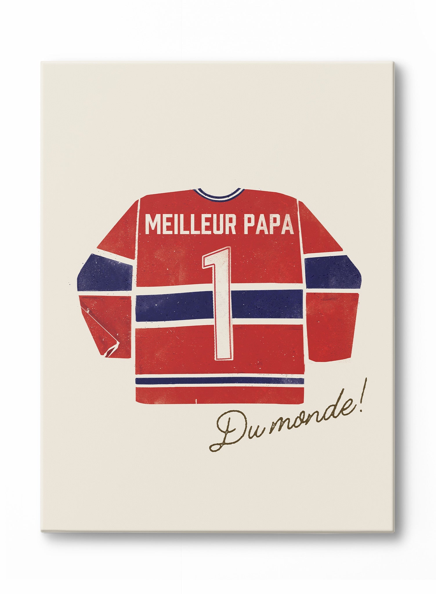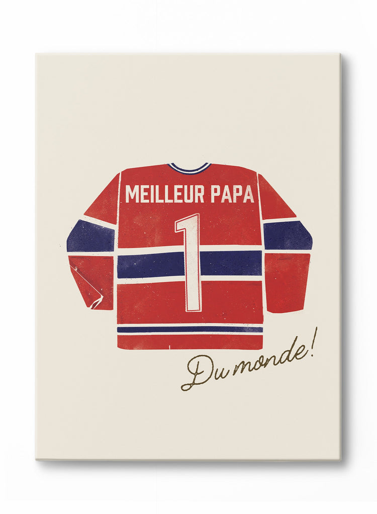 Celebrating fatherhood with sporting enthusiasm, this vintage-inspired canvas displays a classic red hockey jersey, personalized with the heartwarming message "Meilleur Papa Du Monde!" Bold, clean lines and an authentic team-style aesthetic showcase team pride with thoughtful sentimentality.