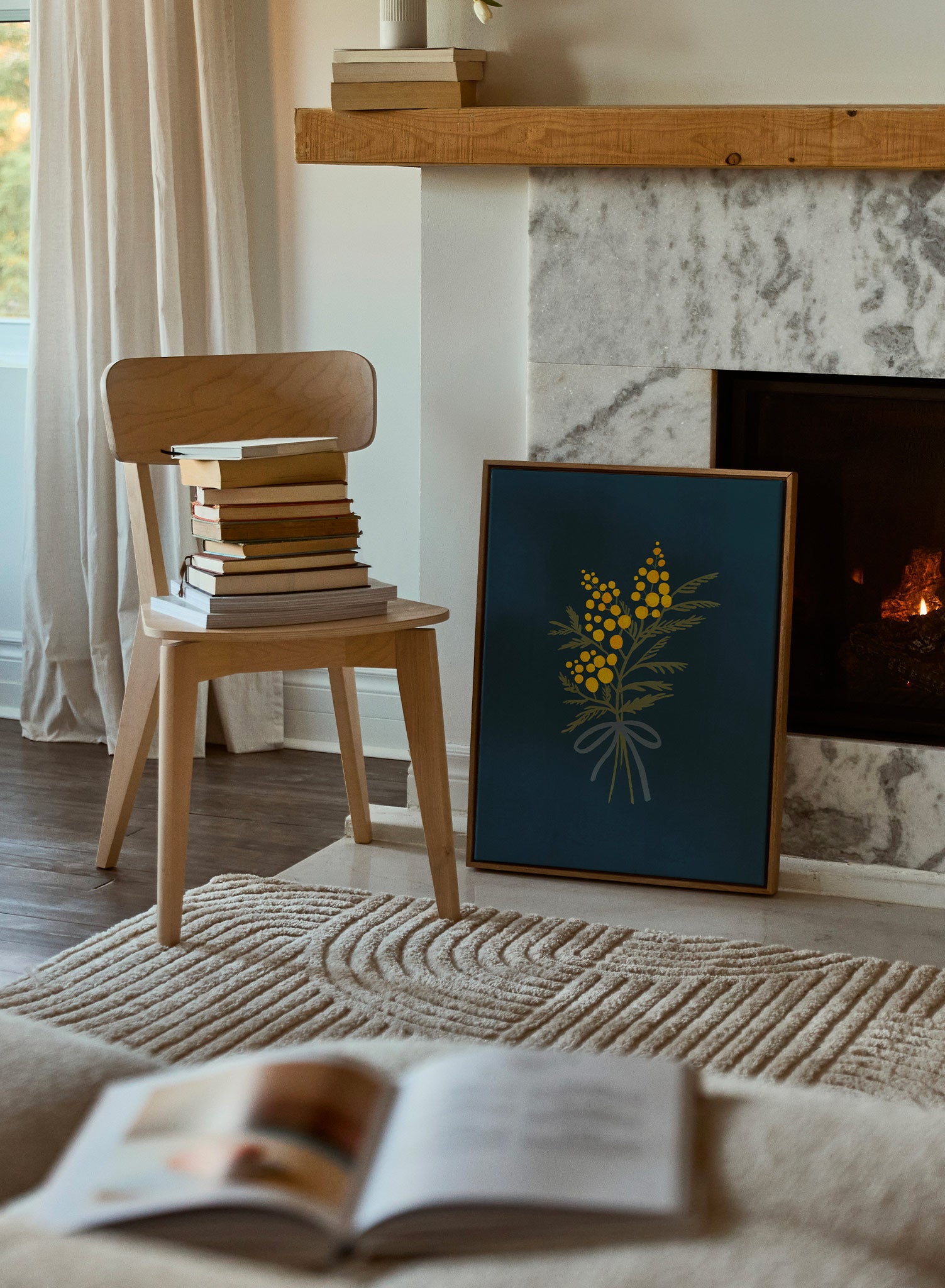 A vivid bouquet of golden mimosa blooms bursts forth against a rich teal background in this contemporary composition. The stylized simplicity celebrates modern elegance while adding a seasonal touch.