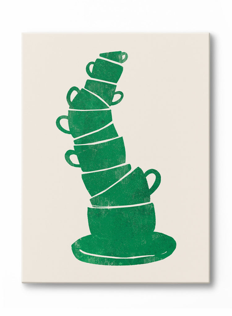 This minimalist canvas captures a moment of playful chaos with a wobbly, precarious stack of coffee cups. Rendered in a single, bold shade of green, the cups teeter on top of one another, suggesting the satisfying aftermath of a busy coffee service or the prelude to a disastrous crash. The design is simple, graphic, and full of implied motion.