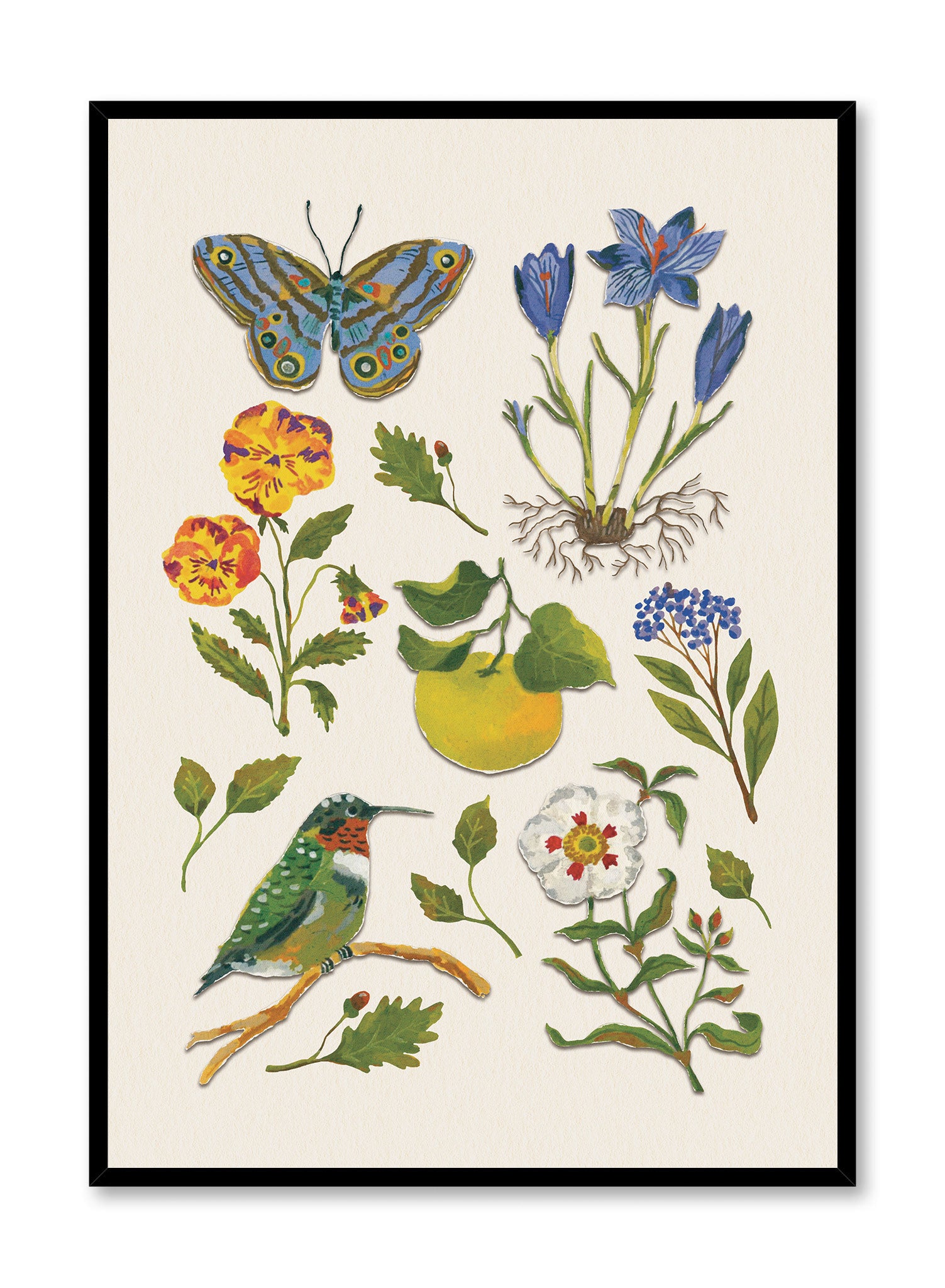 A vibrant tableau of nature unfolds in this print, where a kaleidoscope of flora and fauna is meticulously arranged against a soft cream backdrop. A striking butterfly with intricate blue and orange patterns flutters above, while delicate blue flowers and lush green leaves add a touch of serenity. The scene is anchored by a charming bird perched on a branch, its feathers a lively mix of green and red, bringing a sense of life and movement to the composition.