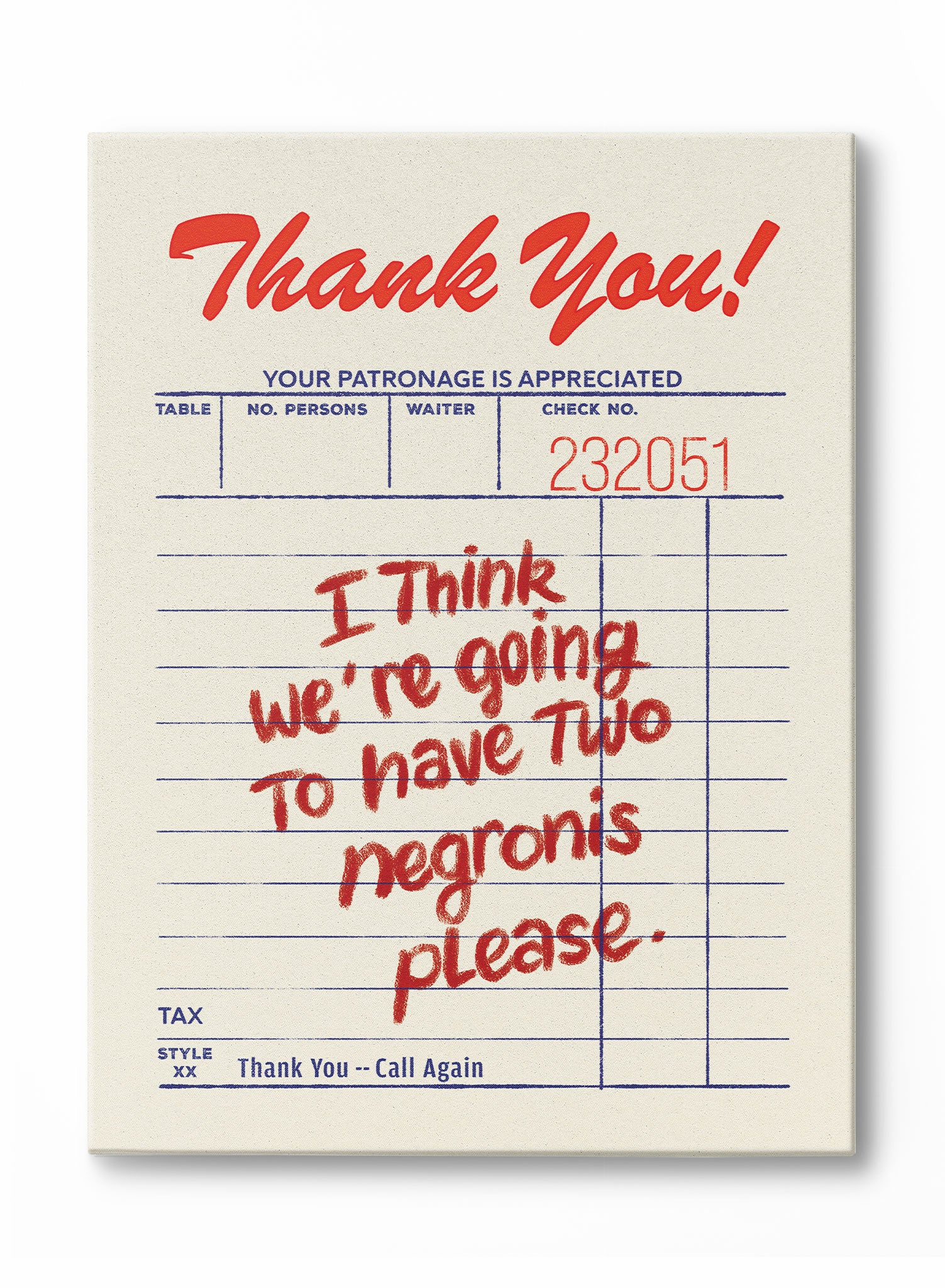 This canvas cleverly captures a moment of decision at a restaurant, designed to look like a classic guest check. At the top, a cheerful "Thank You!" is printed in a red script, while below, a handwritten order reads, "I Think we're going To have Two negroni's please." This piece celebrates the delicious anticipation of the first cocktail of the evening.