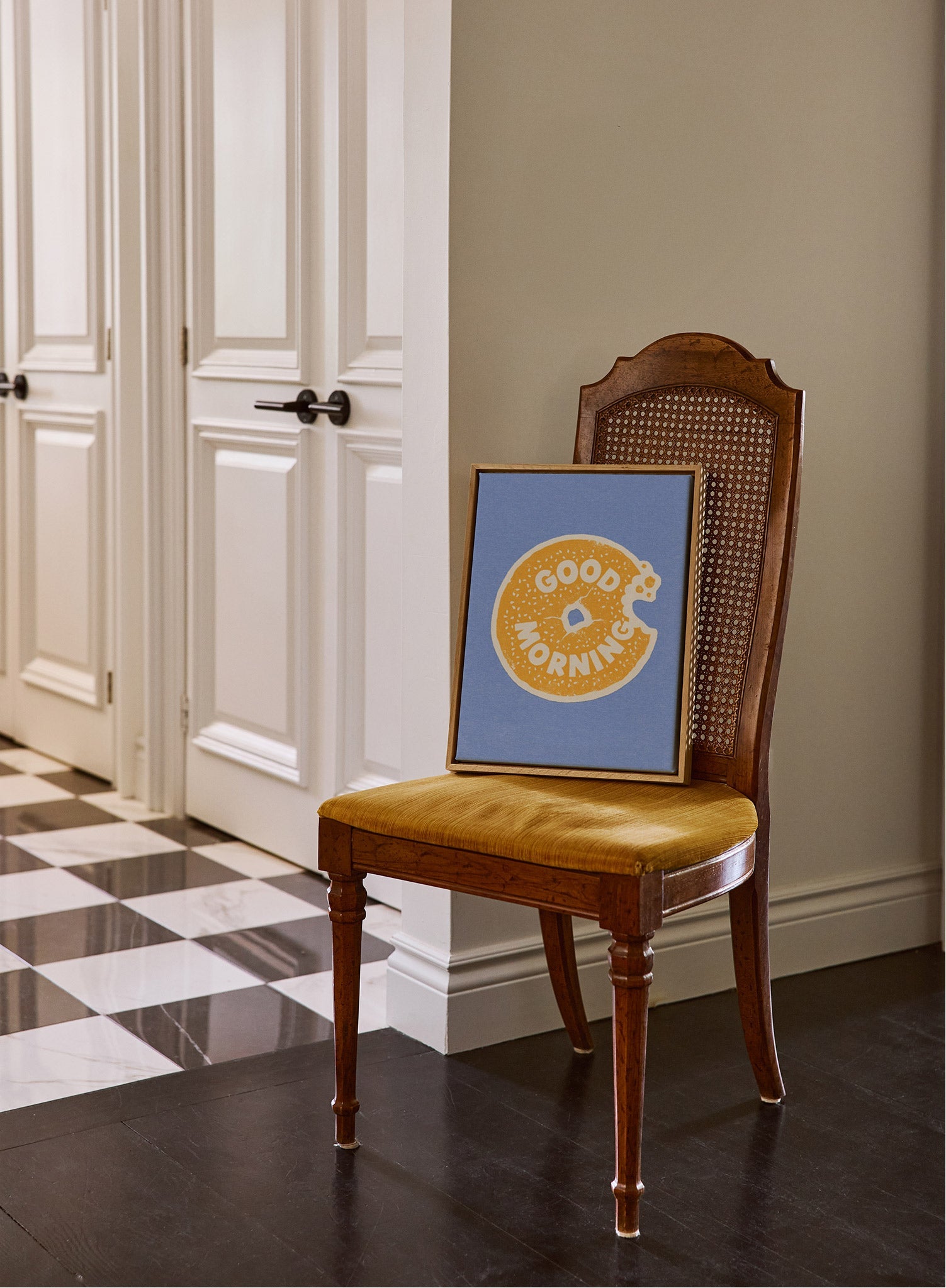 The beauty of this piece lies in its complementary color palette and whimsical subject matter. The warm yellow of the bagel contrasts perfectly with the cool blue, making the illustration pop. The textured, slightly imperfect printing style gives it a rustic, screen-printed quality that feels both authentic and artful.