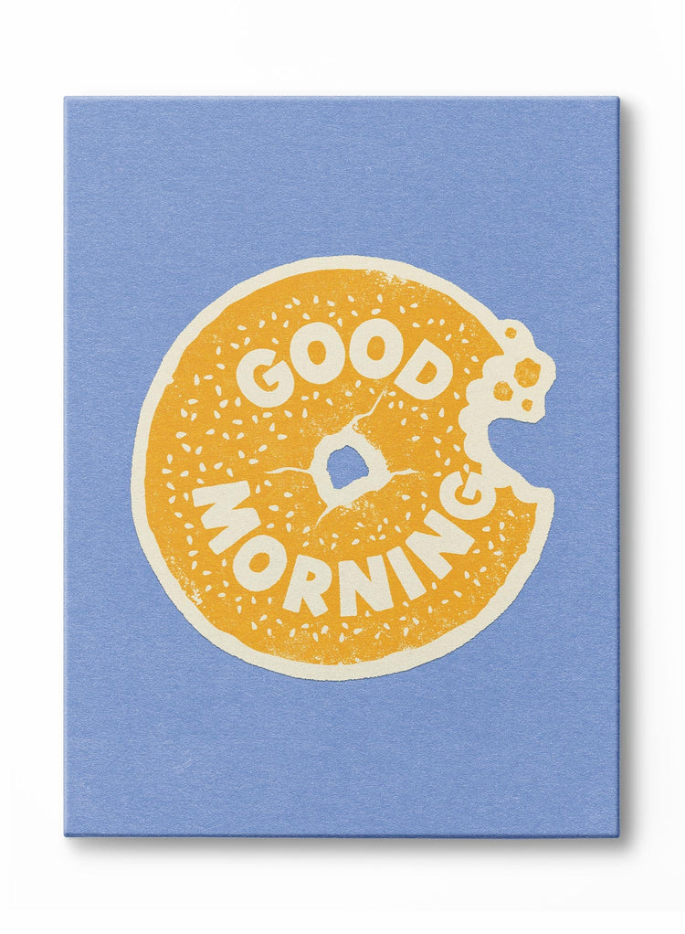 This canvas offers a cheerful "Good Morning" from a classic sesame seed bagel, complete with a playful bite taken out of the side. The friendly greeting is rendered in a warm, golden-yellow script that follows the curve of the bagel, creating a fun and integrated design. The entire composition is set against a cool, periwinkle blue background.
