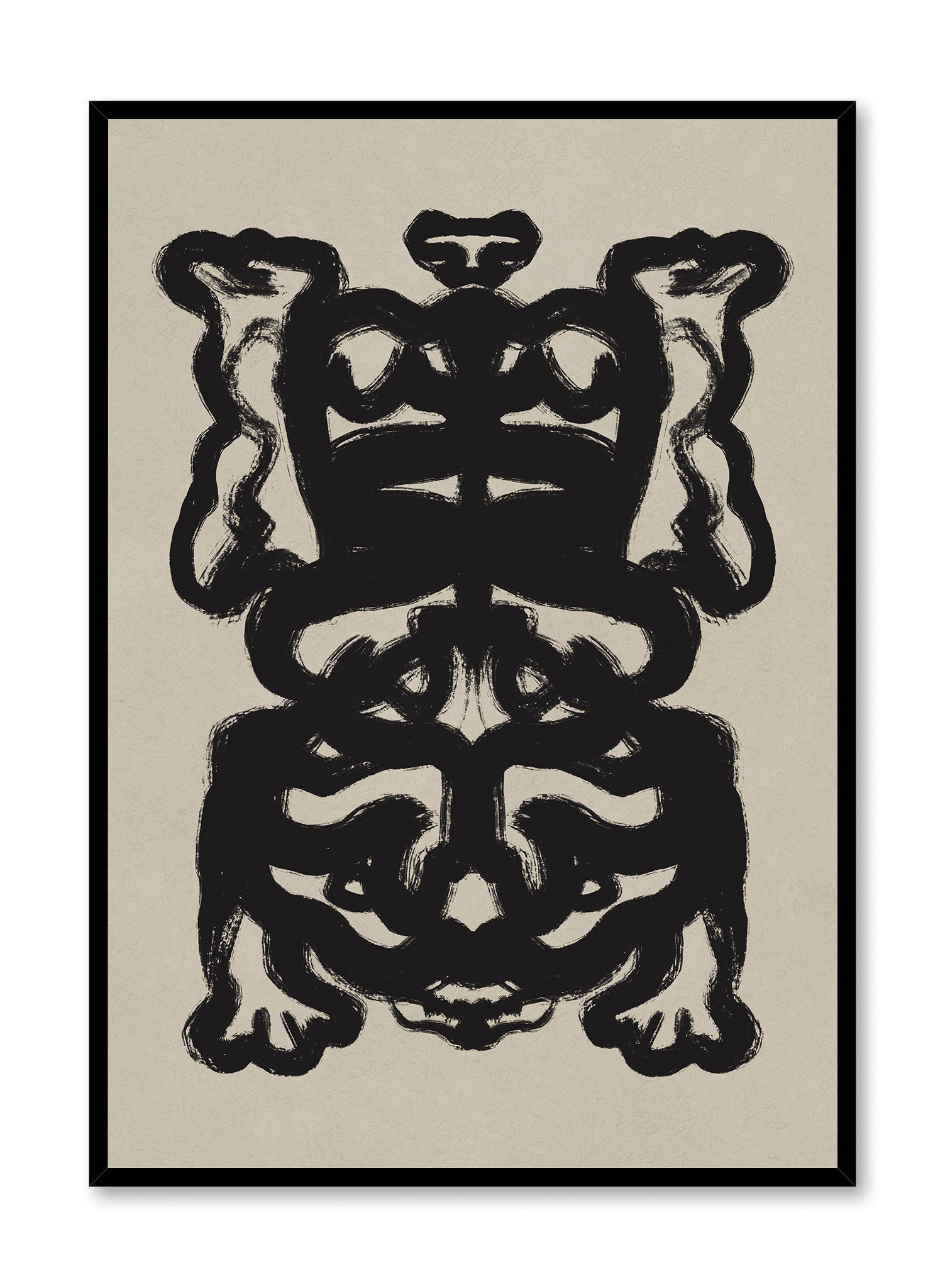 This print showcases bold black brushwork against a neutral cream background, embodying the Asian minimalism aesthetic that defines this collection curated for Keefer House. The symmetrical composition features flowing, organic forms that mirror the calligraphic influences central to this collection, with thick gestural strokes creating an abstract pattern that feels both structured and fluid.