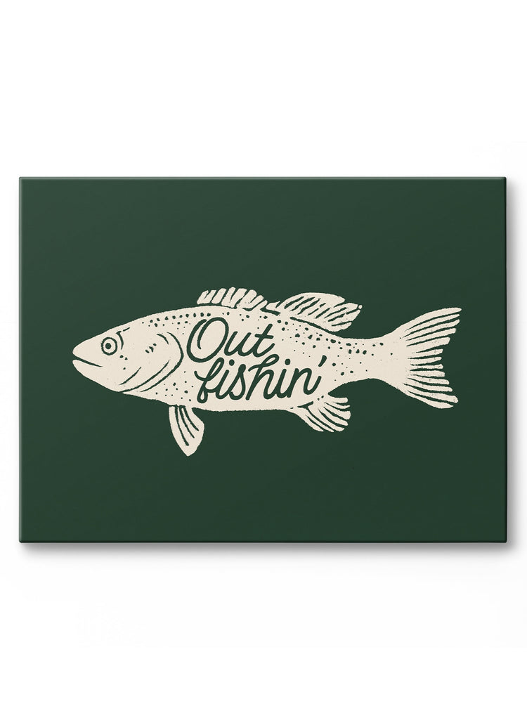 Showcasing a minimalist fish illustration with the phrase "Out Fishin’" cleverly integrated into its silhouette, this canvas features crisp white graphics against a deep forest-green background. Its understated, graphic simplicity immediately charms the eye.