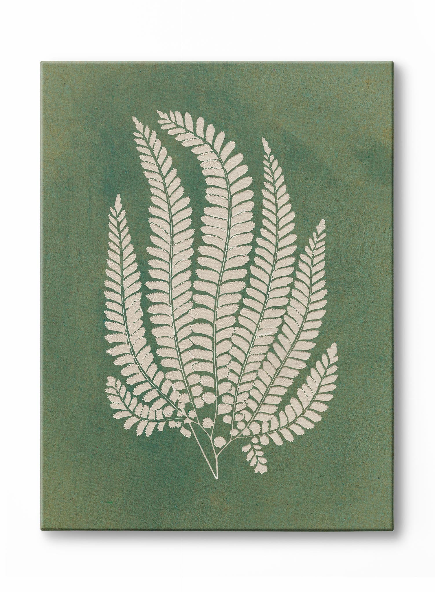 The muted green tones and soft, textured finish lend this artwork a vintage-inspired charm. The intricate details of the fern fronds feel organic yet clean, making it a versatile addition to any space.