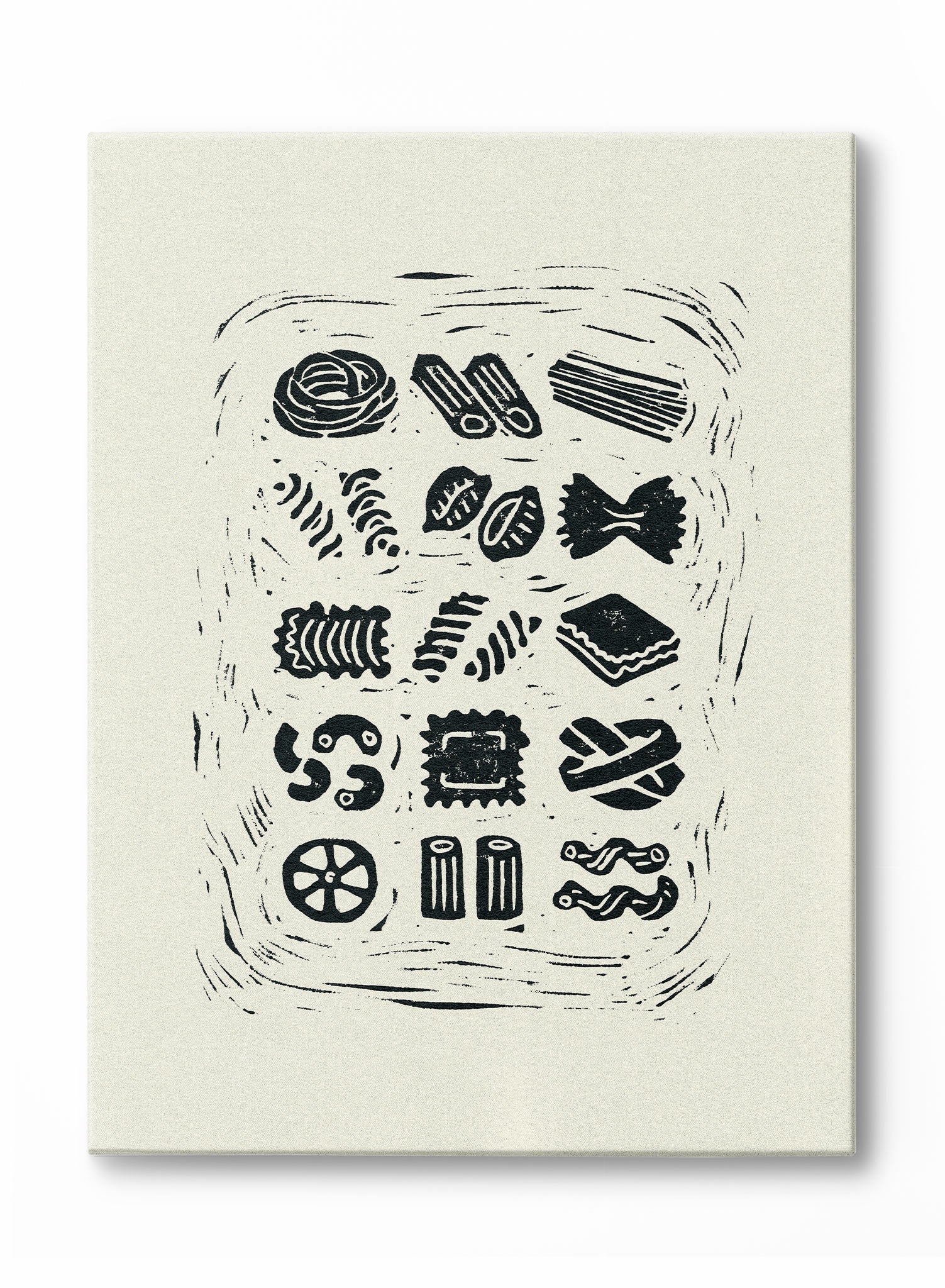 This striking linocut canvas is a graphic celebration of pasta in all its glorious forms. A collection of sixteen different pasta shapes, from fettuccine and farfalle to ravioli and rotelle, are arranged in a neat grid. The simple, monochromatic design and hand-carved aesthetic give the piece a rustic, artisanal, and timeless feel.