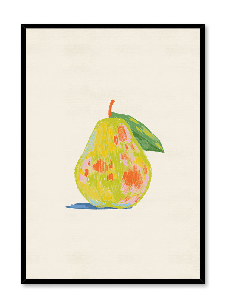 This vibrant pear print transforms a simple fruit into a lively composition of bold brushstrokes and expressive color. Shades of green, yellow, and hints of pink and orange blend together in a painterly style that gives the piece energy and texture. The rich, hand-drawn details make the fruit feel almost tangible, while the clean background keeps the composition fresh and modern.