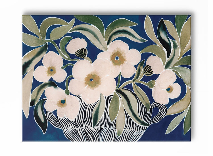 Now, that's a show-stopper! This horizontal floral painting stars light pink and yellow flowers and greenery over a deep blue background.