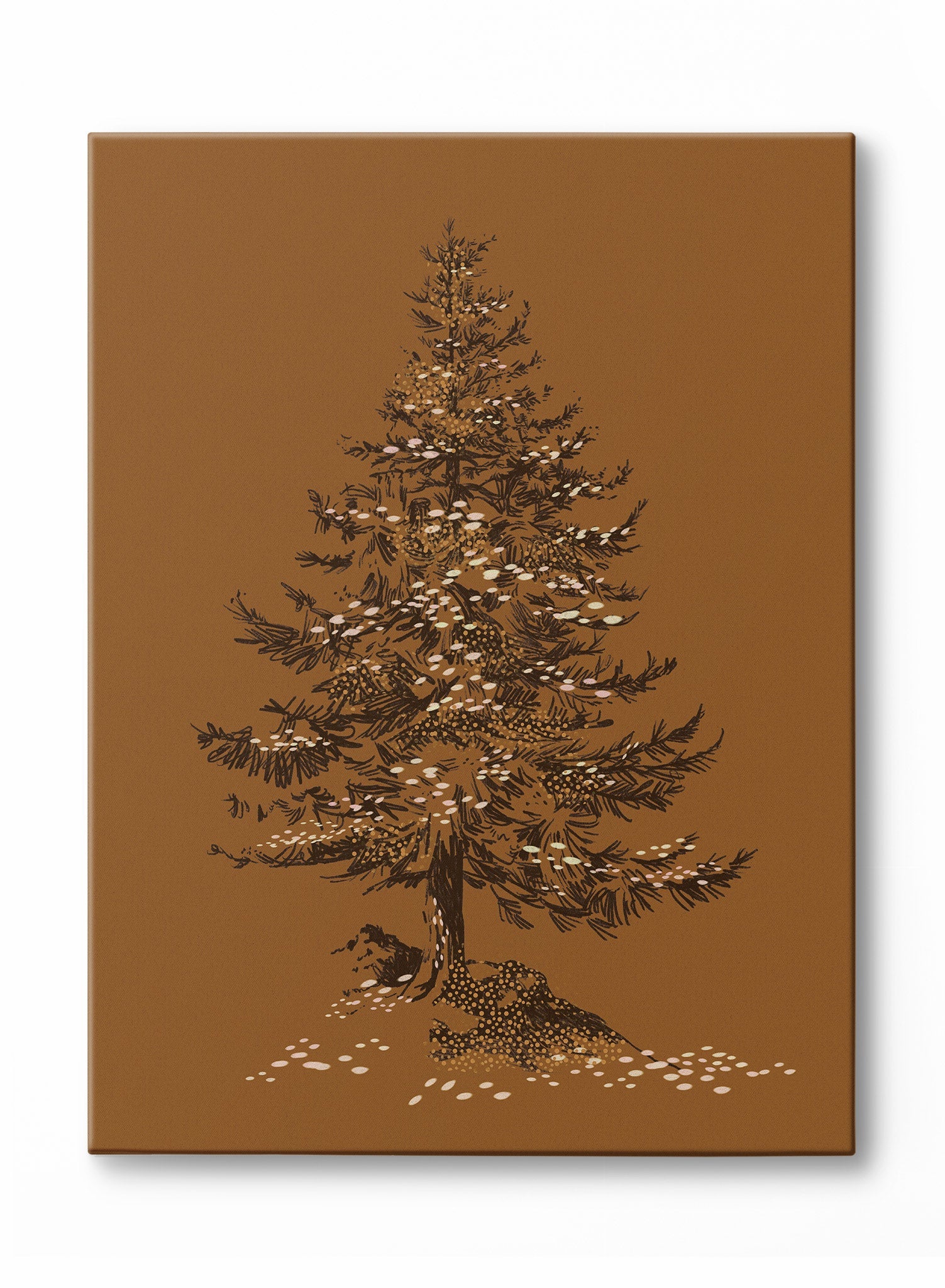 This canvas features a solitary evergreen tree, intricately detailed against a rich, earthy brown background. The tree's branches are adorned with delicate, scattered leaves, creating a sense of gentle movement. The overall composition is both serene and striking, capturing the quiet beauty of nature in a minimalist style.