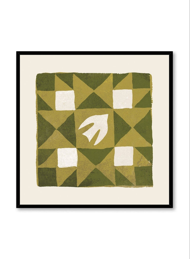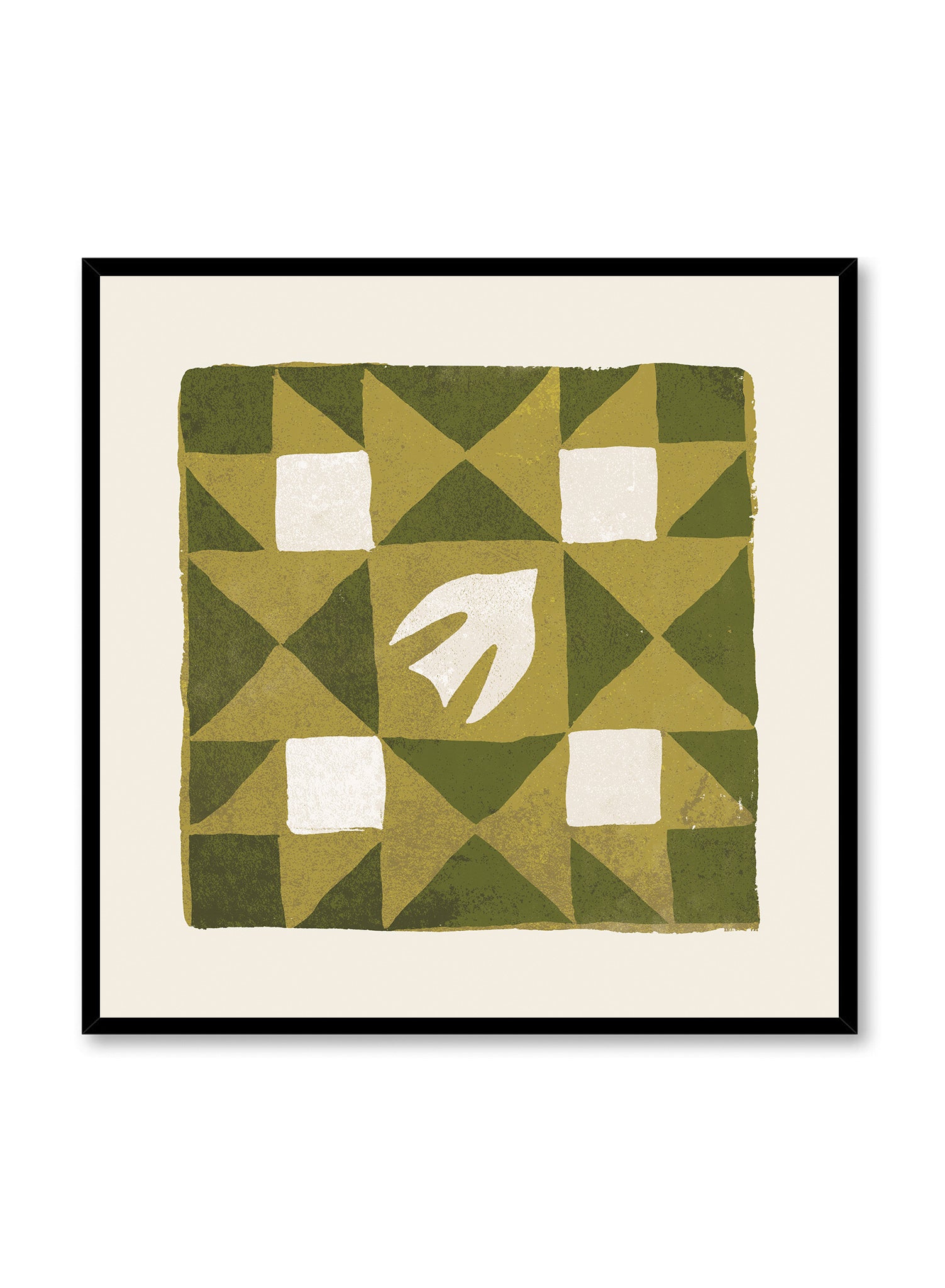 This print presents a geometric composition featuring a central white hand motif surrounded by a patchwork of olive and moss green triangles and squares. The design is set against a soft cream background, creating a striking contrast that draws the eye to the intricate patterns and shapes.