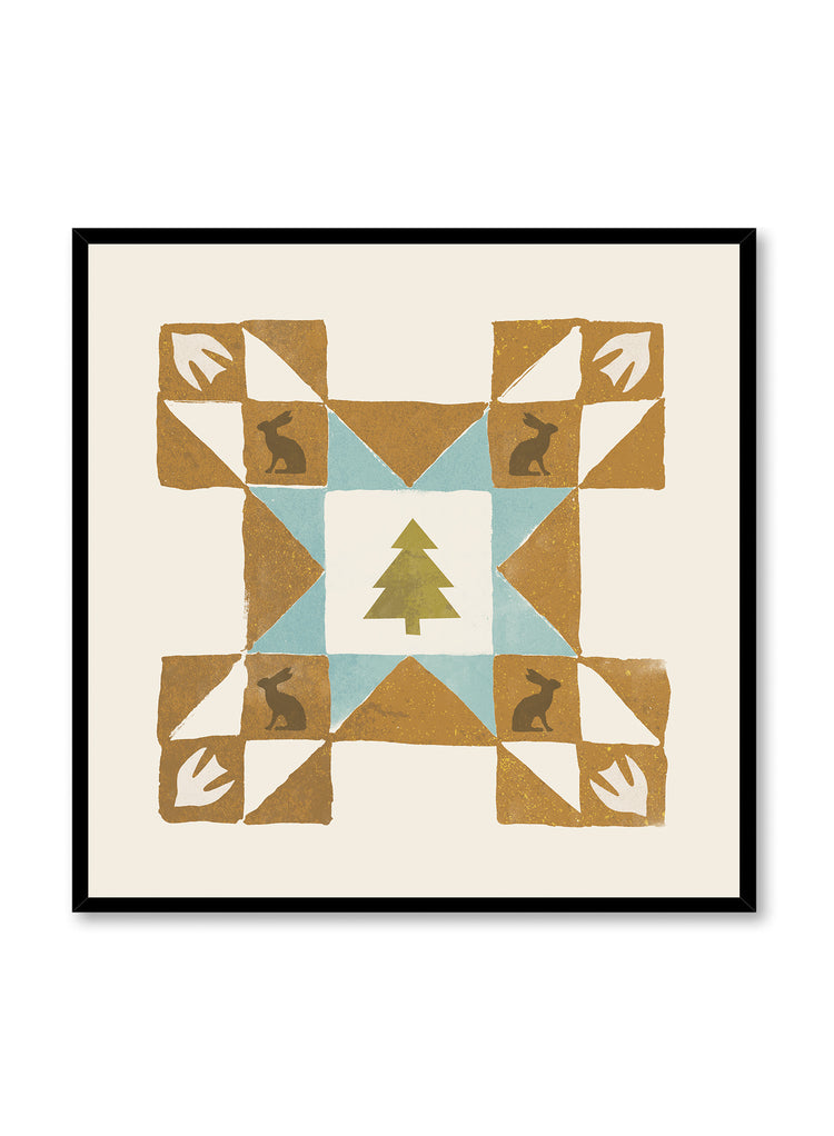 This print presents a geometric design featuring a central evergreen tree, surrounded by a symmetrical arrangement of triangles and squares. The pattern includes silhouettes of woodland creatures, adding a touch of nature-inspired charm. The composition is balanced and harmonious, drawing the eye to its intricate details.