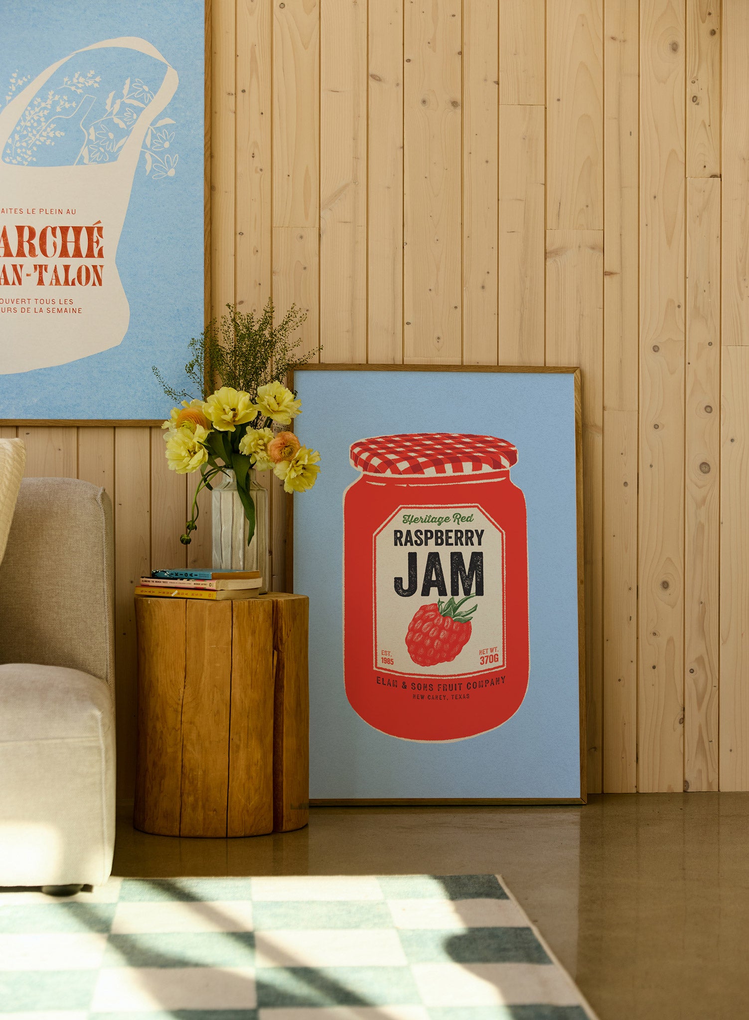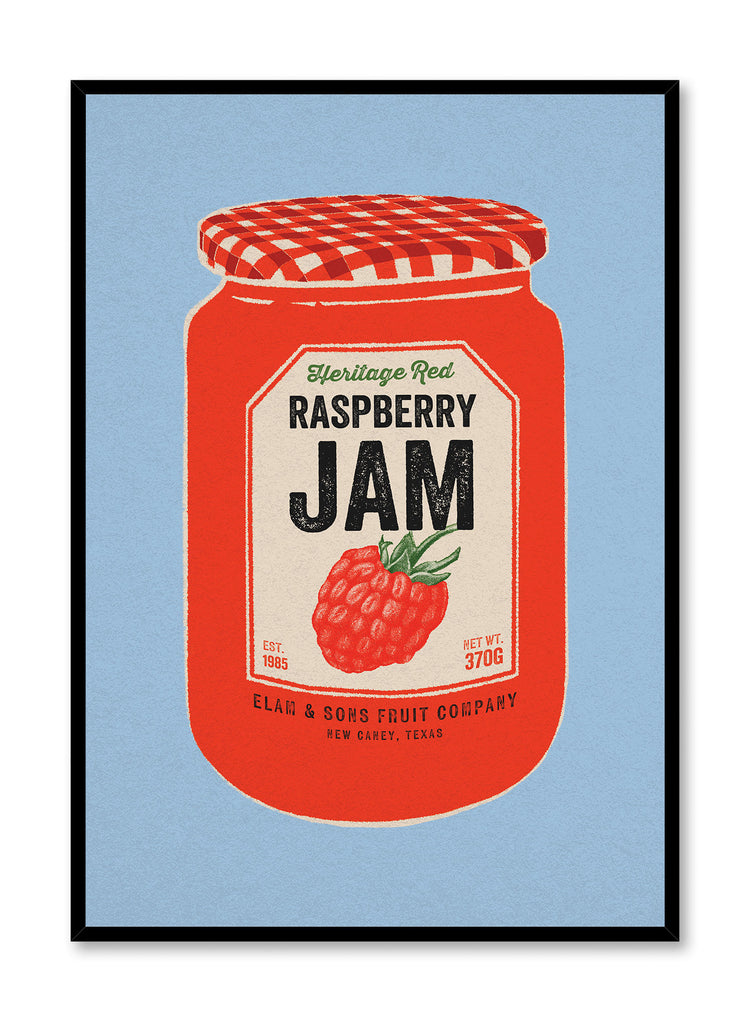A bold red jar of raspberry jam, topped with a classic gingham lid, takes center stage in this retro-inspired print. The deep red hues of the jar contrast beautifully against a cool blue background, while the vintage typography and hand-drawn label details give it an old-school grocery store charm. The "Heritage Red" text and established date add a nostalgic, small-town feel.