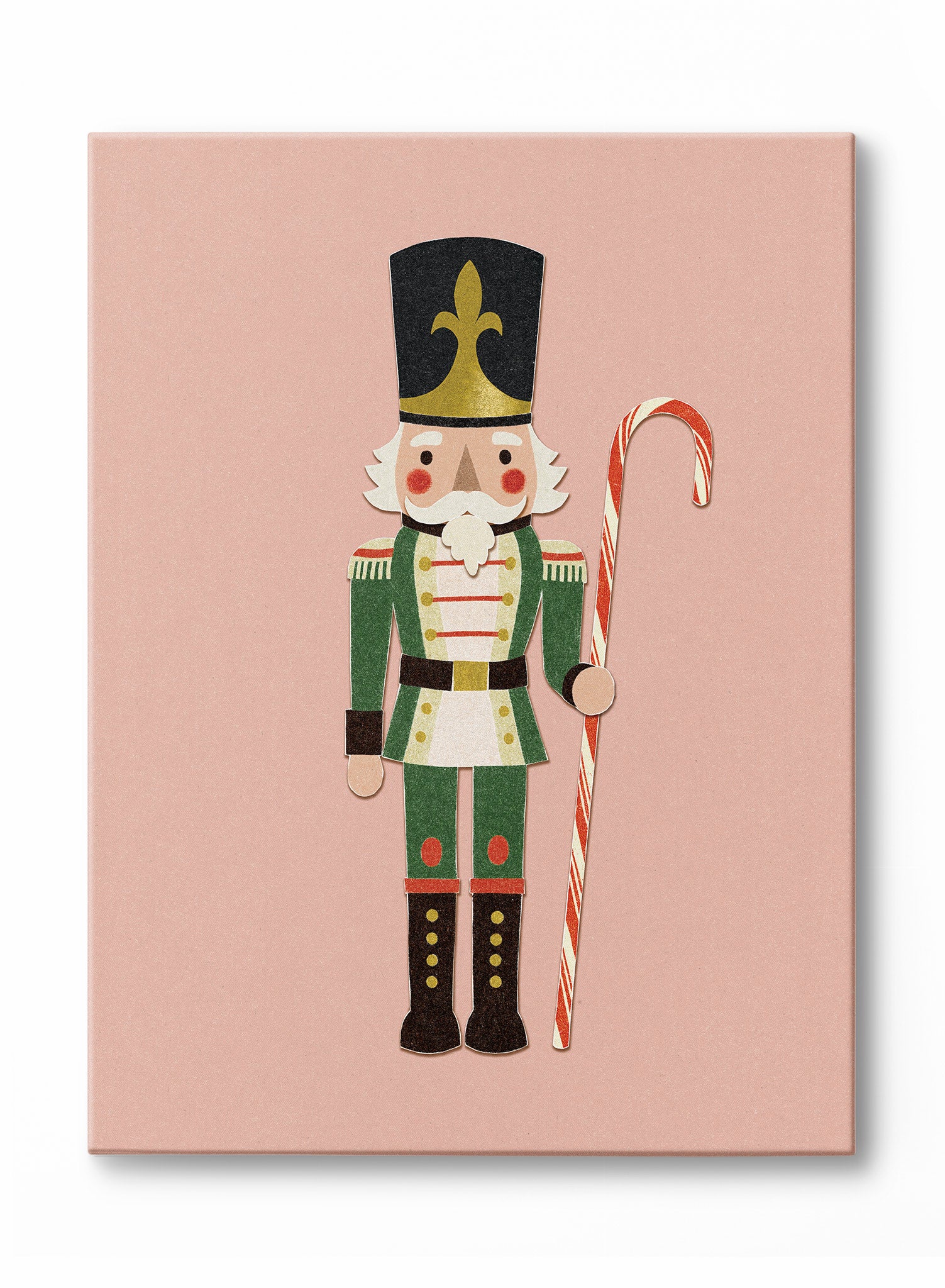 This charming print features a classic nutcracker soldier, standing proudly against a soft pink backdrop. Dressed in a traditional green and white uniform, the nutcracker holds a candy cane, adding a festive touch. The soldier's bold black hat and detailed facial features bring a playful yet regal presence to the piece.