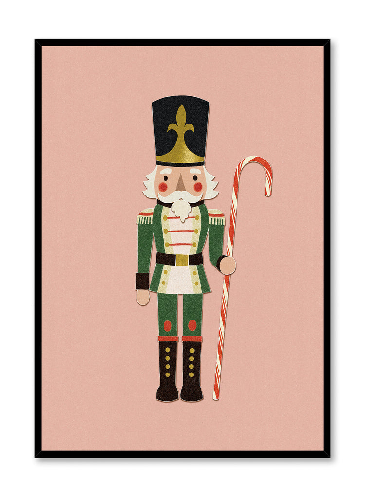 The color palette is both warm and inviting, with the pink background providing a gentle contrast to the nutcracker's vibrant attire. The textures are smooth, enhancing the print's clean and polished look. The candy cane's red and white stripes add a pop of color, drawing the eye and creating visual interest.