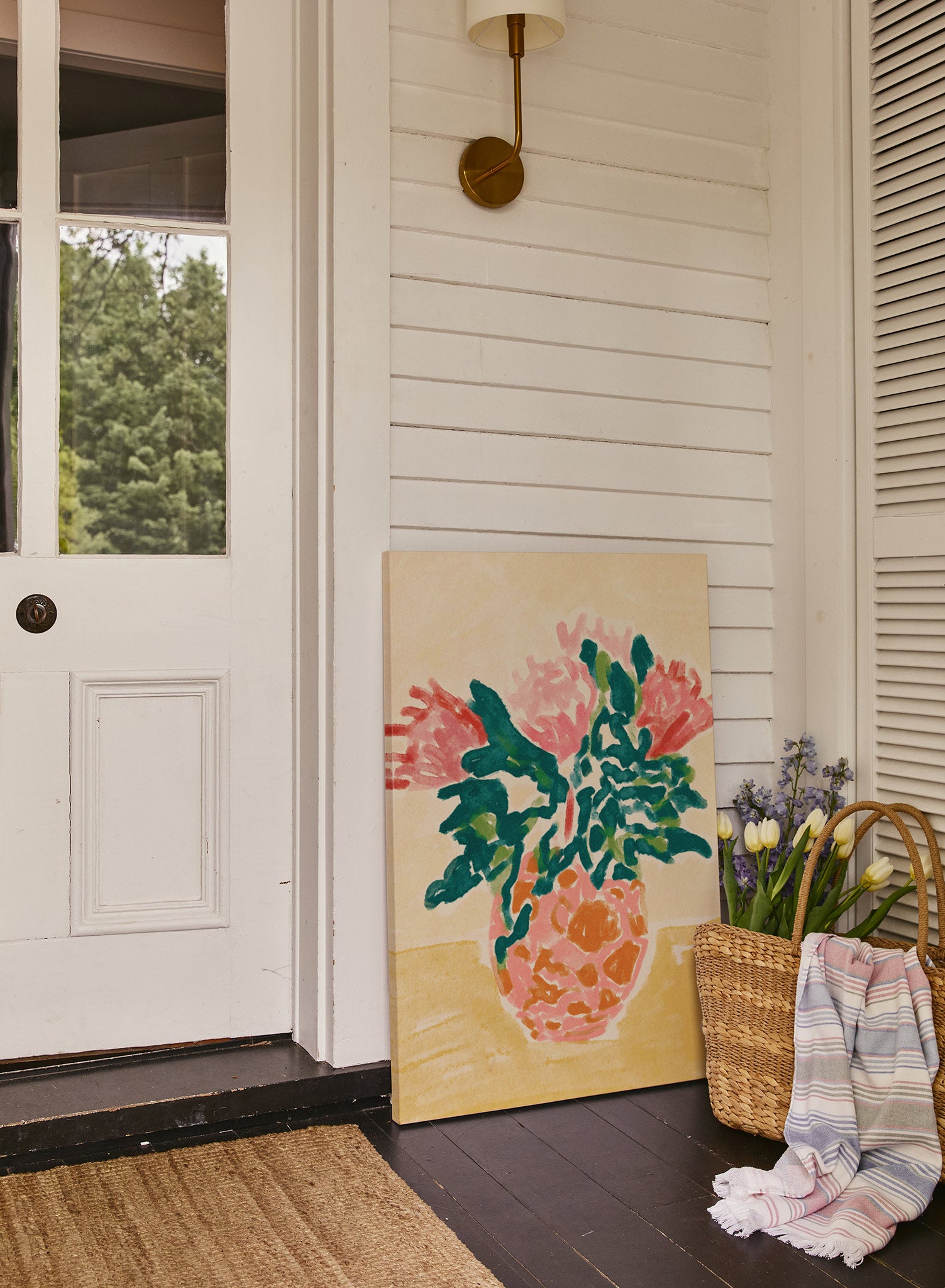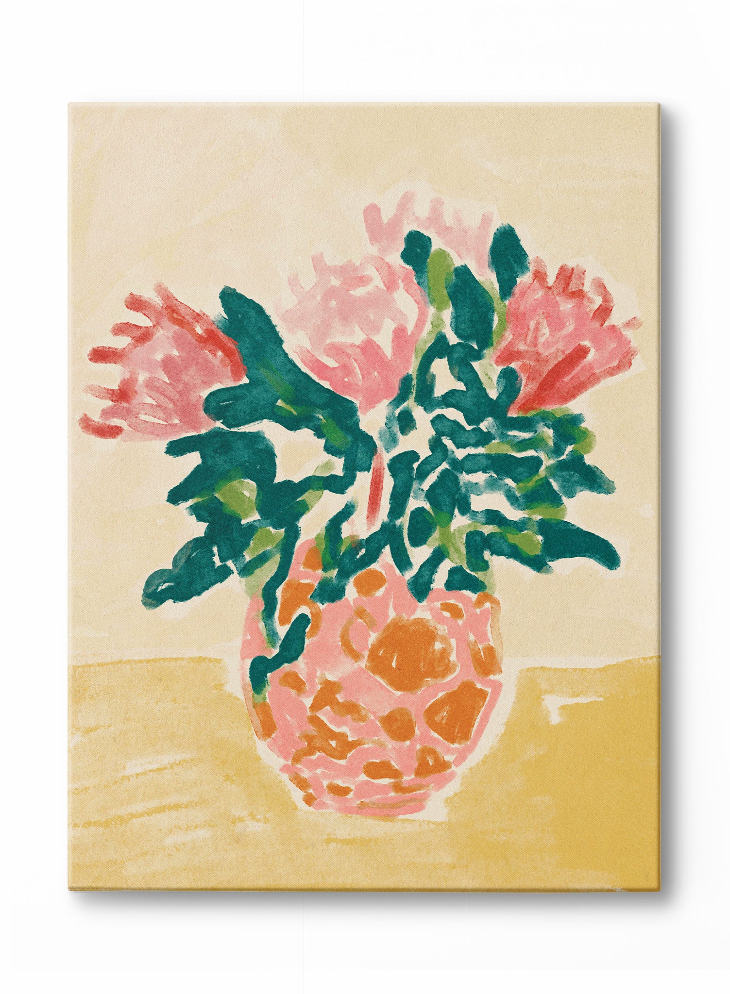 Bring a touch of color and nostalgia to your walls with this painting of pink flowers with green leaves in an orange vase over a textured yellow background.