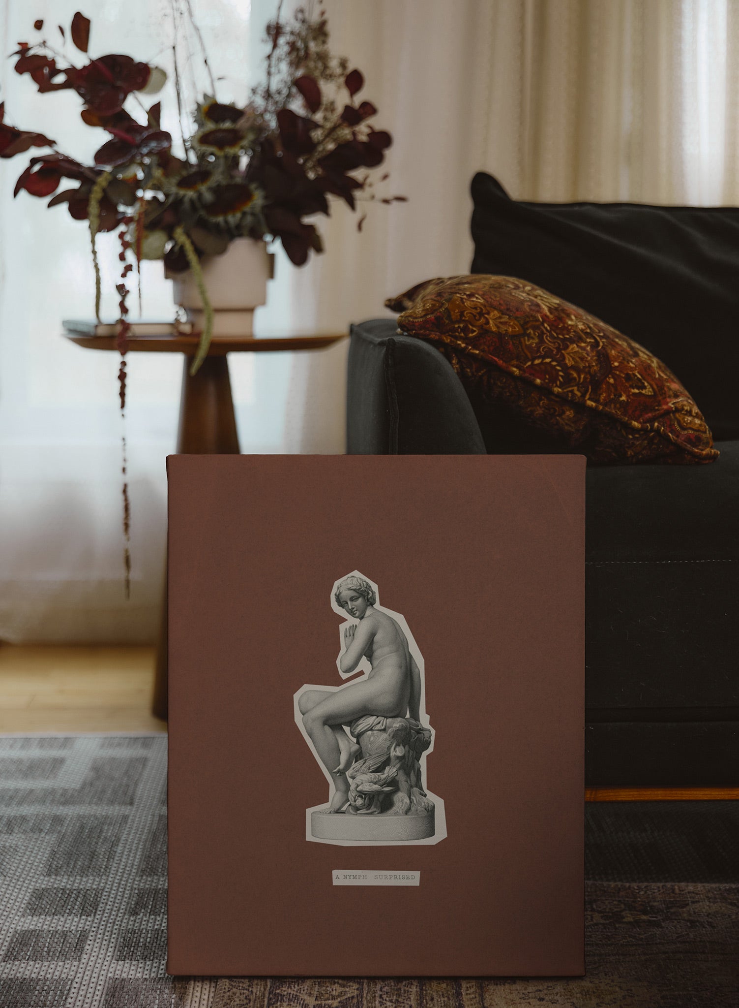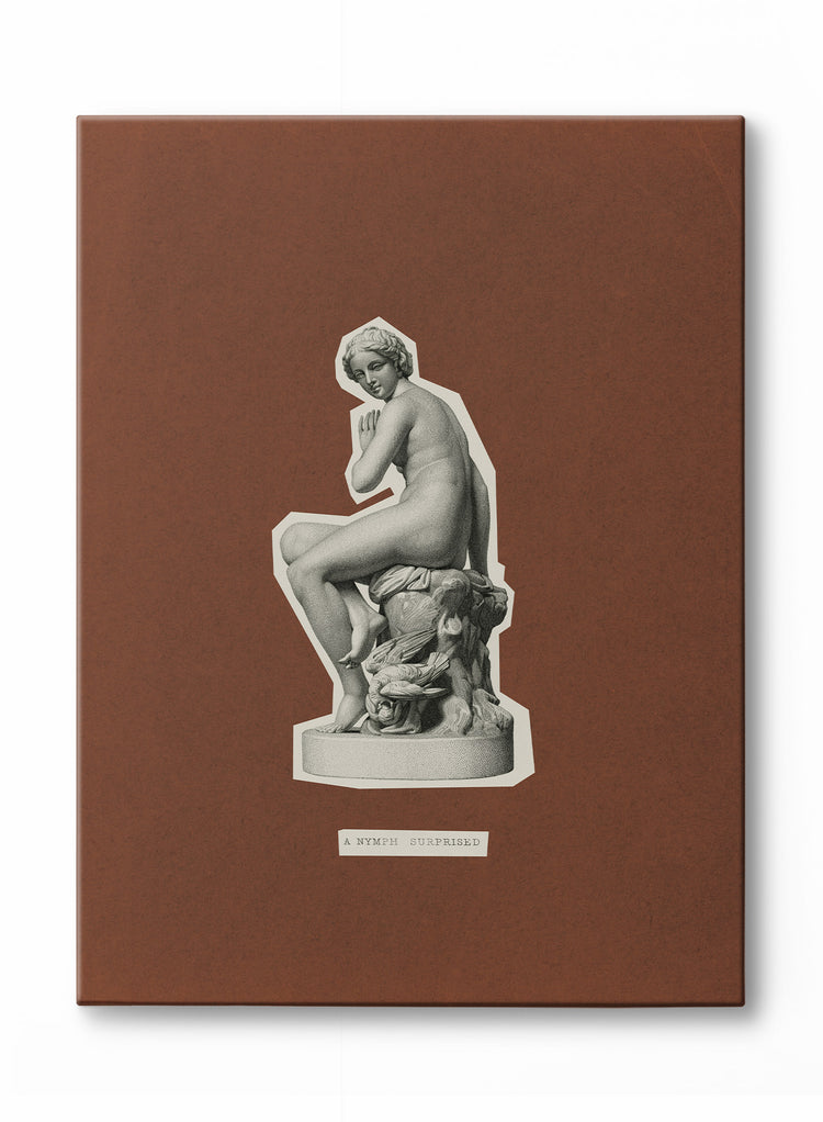 This classical canvas, featuring a vintage engraving of a sculpted nymph, is placed against a textured brown backdrop that highlights its antiquity. The nymph, caught in a moment of surprise, is delicately etched with fine details that capture her expressive posture and serene facial features.