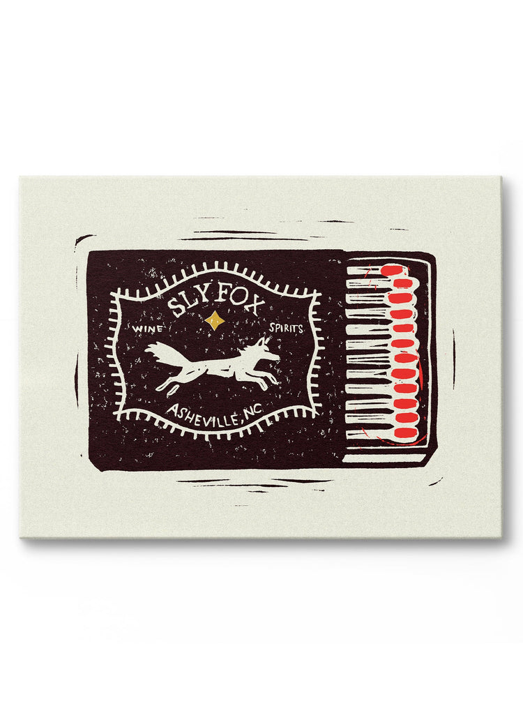This canvas features a graphic illustration of a vintage-style matchbook from the "Sly Fox" bar in Asheville, NC. Rendered in a bold, linocut style, the design includes a leaping fox and classic typography, with a row of red-tipped matches neatly exposed. It’s a playful nod to restaurant ephemera and the tactile quality of a treasured souvenir from a favorite haunt.