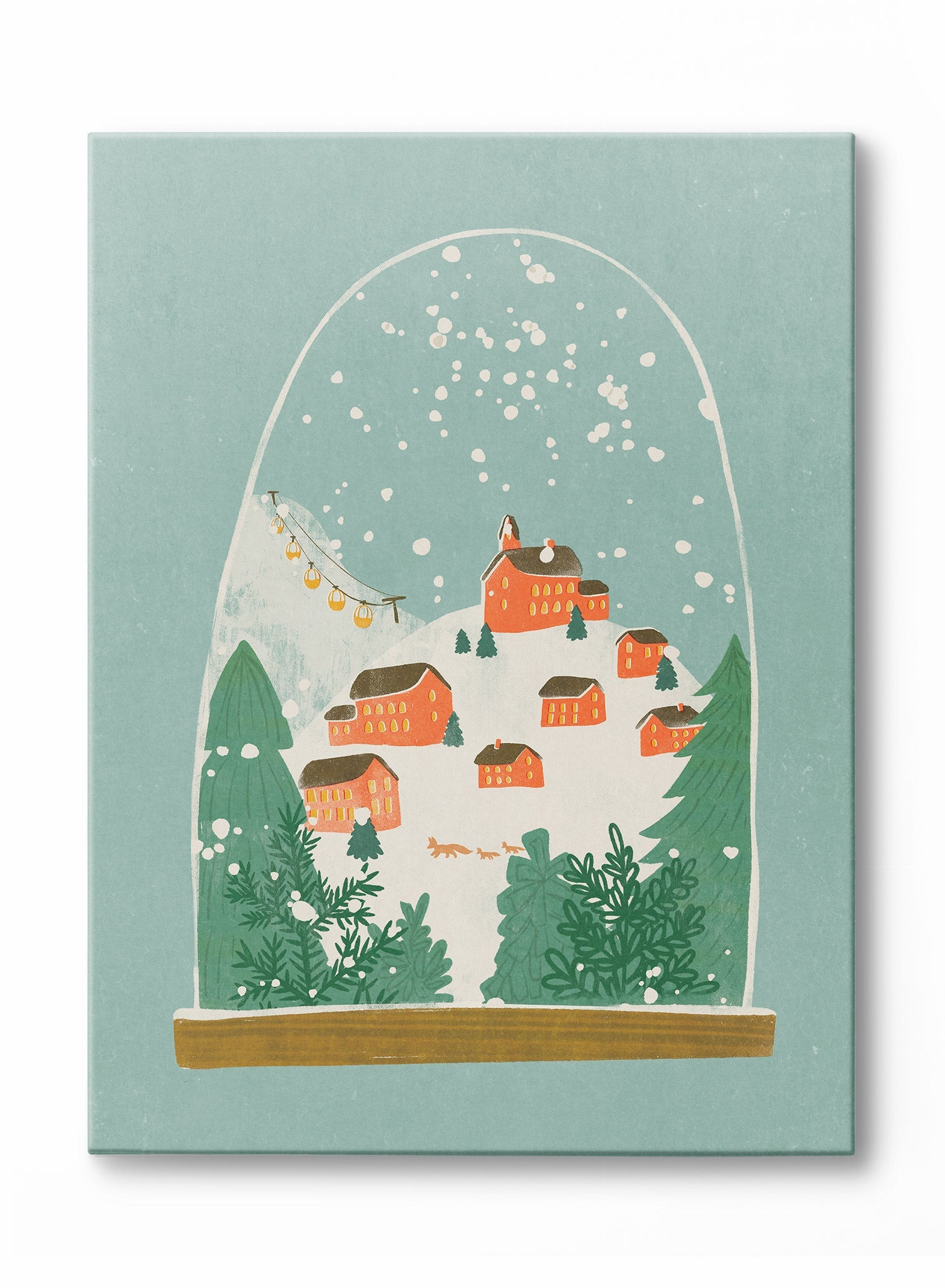 This charming canvas captures a quaint winter village nestled within a snow globe. The scene features cozy red-roofed houses scattered across a snowy hill, surrounded by lush evergreens. Delicate snowflakes gently fall, adding a serene touch to the idyllic setting. The soft teal background enhances the peaceful atmosphere, while the warm hues of the buildings create a welcoming contrast.