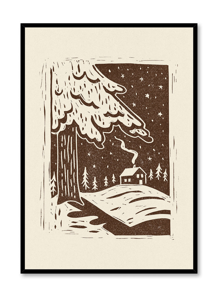 This print captures a serene winter scene, where a cozy cabin nestles amidst gently rolling snow-covered hills. A towering evergreen tree frames the left side, its branches laden with snow. Stars twinkle in the night sky, adding a touch of magic to the tranquil landscape. The cabin, with smoke curling from its chimney, suggests warmth and comfort within.